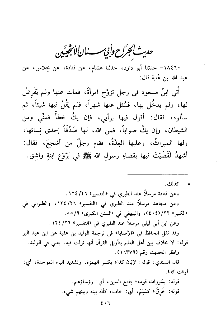 ١٨٤٦٠ - حَدَّثَنَا أَبُو دَاوُدَ، حَدَّثَنَا هِشَامٌ، عَنْ قَتَادَةَ، عَنْ خِلَاسٍ، عَنْ عَبْدِ اللهِ بْنِ عُتْبَةَ، قَالَ: أُتِيَ ابْنُ مَسْعُودٍ فِي رَجُلٍ تَزَوَّجَ امْرَأَةً، فَمَاتَ عَنْهَا وَلَمْ يَفْرِضْ لَهَا، وَلَمْ يَدْخُلْ بِهَا، فَسُئِلَ عَنْهَا شَهْرًا، فَلَمْ يَقُلْ فِيهَا شَيْئًا، ثُمَّ سَأَلُوهُ، فَقَالَ: أَقُولُ فِيهَا بِرَأْيِي، فَإِنْ يَكُ خَطَأً فَمِنِّي وَمِنَ الشَّيْطَانِ، وَإِنْ يَكُ صَوَابًا، فَمِنَ اللهِ، " لَهَا صَدَقَةُ إِحْدَى نِسَائِهَا، وَلَهَا الْمِيرَاثُ، وَعَلَيْهَا الْعِدَّةُ ". فَقَامَ رَجُلٌ مِنْ أَشْجَعَ فَقَالَ: " أَشْهَدُ لَقَضَيْتَ فِيهَا بِقَضَاءِ رَسُولِ اللهِ صَلَّى اللهُ عَلَيْهِ وَسَلَّمَ، فِي بِرْوَعَ ابْنَةِ وَاشِقٍ "