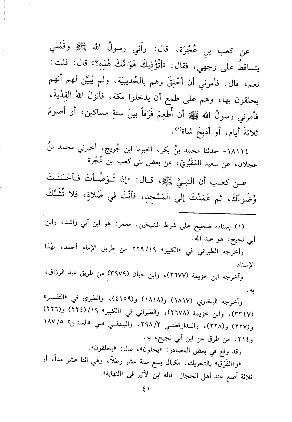 عَنْ كَعْبِ بْنِ عُجْرَةَ، قَالَ: رَآنِي رَسُولُ اللهِ صَلَّى اللهُ عَلَيْهِ وَسَلَّمَ، وَقَمْلِي يَتَسَاقَطُ عَلَى وَجْهِي، فَقَالَ: " أَتُؤْذِيكَ هَوَامُّكَ هَذِهِ؟ " قَالَ: قُلْتُ: نَعَمْ، قَالَ: فَأَمَرَنِي أَنْ أَحْلِقَ وَهُمْ بِالْحُدَيْبِيَةِ، وَلَمْ يُبَيِّنْ لَهُمْ أَنَّهُمْ يَحْلِقُونَ بِهَا، وَهُمْ عَلَى طَمَعٍ أَنْ يَدْخُلُوا مَكَّةَ، فَأَنْزَلَ اللهُ الْفِدْيَةَ، فَأَمَرَنِي رَسُولُ اللهِ صَلَّى اللهُ عَلَيْهِ وَسَلَّمَ أَنْ أُطْعِمَ فِرْقًا بَيْنَ سِتَّةِ مَسَاكِينَ، أَوْ أَصُومَ ثَلَاثَةَ أَيَّامٍ، أَوْ أَذْبَحَ شَاةً (١)
