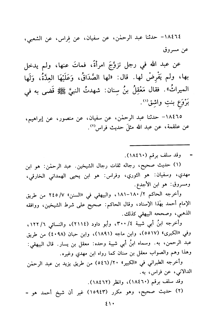 (١) حديث صحيح، رجاله ثقات رجال الشيخين. عبد الرحمن: هو ابن مهدي، وسفيان: هو الثوري، وفراس: هو ابن يحيي الهمداني الخارفي، ومسروق: هو ابن الأجدع.