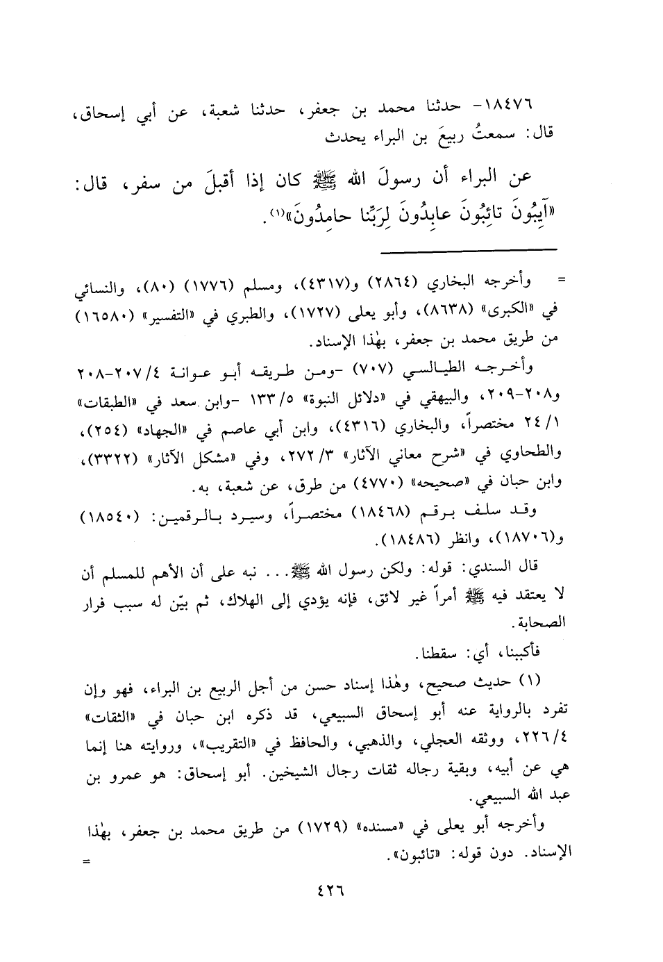 ١٨٤٧٦ - حَدَّثَنَا مُحَمَّدُ بْنُ جَعْفَرٍ، حَدَّثَنَا شُعْبَةُ، عَنْ أَبِي إِسْحَاقَ، قَالَ: سَمِعْتُ رَبِيعَ بْنَ الْبَرَاءِ، يُحَدِّثُ عَنِ الْبَرَاءِ، أَنَّ رَسُولَ اللهِ صَلَّى اللهُ عَلَيْهِ وَسَلَّمَ: كَانَ إِذَا أَقْبَلَ مِنْ سَفَرٍ، قَالَ: " آيِبُونَ تَائِبُونَ، عَابِدُونَ لِرَبِّنَا، حَامِدُونَ " (١)