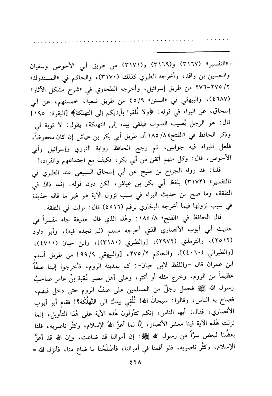 = "التفسير" (٣١٦٧) و (٣١٦٩) و (٣١٧١) من طريق أبي الأحوص وسفيان والحسين بن واقد، وأخرجه الطبري كذلك (٣١٧٠) ، والحاكم في "المستدرك" ٢/٢٧٥-٢٧٦ من طريق إسرائيل، وأخرجه الطحاوي في "شرح مشكل الآثار" (٤٦٨٧) ، والبيهقي في "السنن" ٩/٤٥ من طريق شعبة، خمستهم، عن أبي إسحاق، عن البراء في قوله: (ولا تُلقوا بأيديكم إلى التهلكة) [البقرة: ١٩٥]