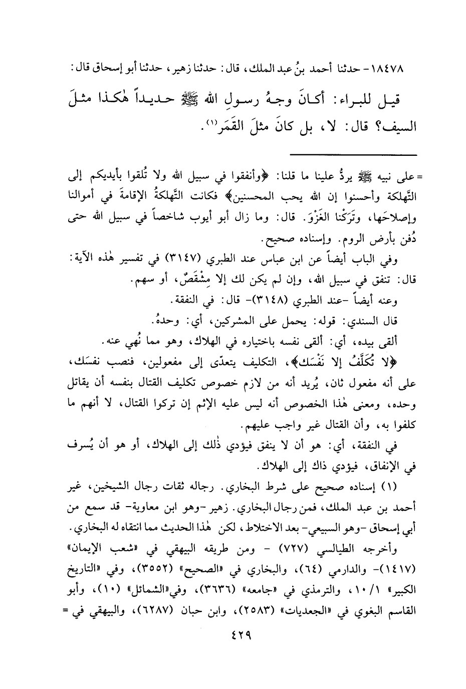 ١٨٤٧٨ - حَدَّثَنَا أَحْمَدُ بْنُ عَبْدِ الْمَلِكِ، قَالَ: حَدَّثَنَا زُهَيْرٌ، حَدَّثَنَا أَبُو إِسْحَاقَ، قَالَ: قِيلَ لِلْبَرَاءِ: أَكَانَ وَجْهُ رَسُولِ اللهِ صَلَّى اللهُ عَلَيْهِ وَسَلَّمَ حَدِيدًا هَكَذَا مِثْلَ السَّيْفِ؟ قَالَ: " لَا، بَلْ كَانَ مِثْلَ الْقَمَرِ " (١)