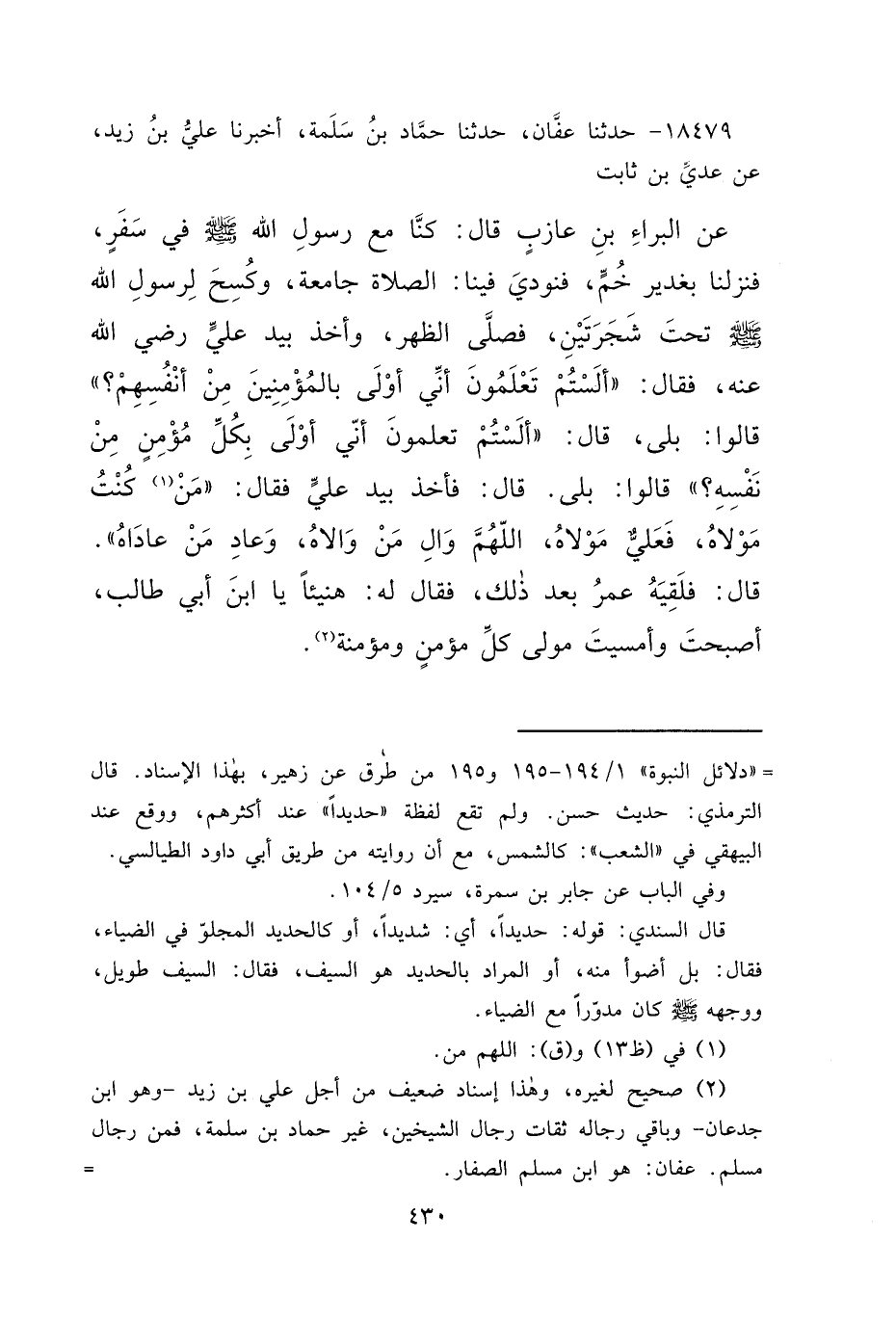 ١٨٤٧٩ - حَدَّثَنَا عَفَّانُ، حَدَّثَنَا حَمَّادُ بْنُ سَلَمَةَ، أَخْبَرَنَا عَلِيُّ بْنُ زَيْدٍ، عَنْ عَدِيِّ بْنِ ثَابِتٍ، عَنِ الْبَرَاءِ بْنِ عَازِبٍ، قَالَ: كُنَّا مَعَ رَسُولِ اللهِ صَلَّى اللهُ عَلَيْهِ وَسَلَّمَ فِي سَفَرٍ، فَنَزَلْنَا بِغَدِيرِ خُمٍّ، فَنُودِيَ فِينَا: الصَّلَاةُ جَامِعَةٌ، وَكُسِحَ لِرَسُولِ اللهِ صَلَّى اللهُ عَلَيْهِ وَسَلَّمَ تَحْتَ شَجَرَتَيْنِ، فَصَلَّى الظُّهْرَ، وَأَخَذَ بِيَدِ عَلِيٍّ رَضِيَ اللهُ عَنْهُ، فَقَالَ: " أَلَسْتُمْ تَعْلَمُونَ أَنِّي أَوْلَى بِالْمُؤْمِنِينَ مِنْ أَنْفُسِهِمْ؟ " قَالُوا: بَلَى، قَالَ: " أَلَسْتُمْ تَعْلَمُونَ أَنِّي أَوْلَى بِكُلِّ مُؤْمِنٍ مِنْ نَفْسِهِ؟ " قَالُوا: بَلَى، قَالَ: فَأَخَذَ بِيَدِ عَلِيٍّ، فَقَالَ: " مَنْ (١) كُنْتُ مَوْلَاهُ، فَعَلِيٌّ مَوْلَاهُ، اللهُمَّ وَالِ مَنْ وَالَاهُ، وَعَادِ مَنْ عَادَاهُ " قَالَ: فَلَقِيَهُ عُمَرُ بَعْدَ ذَلِكَ، فَقَالَ: " لَهُ هَنِيئًا يَا ابْنَ أَبِي طَالِبٍ، أَصْبَحْتَ وَأَمْسَيْتَ مَوْلَى كُلِّ مُؤْمِنٍ، وَمُؤْمِنَةٍ " (٢)