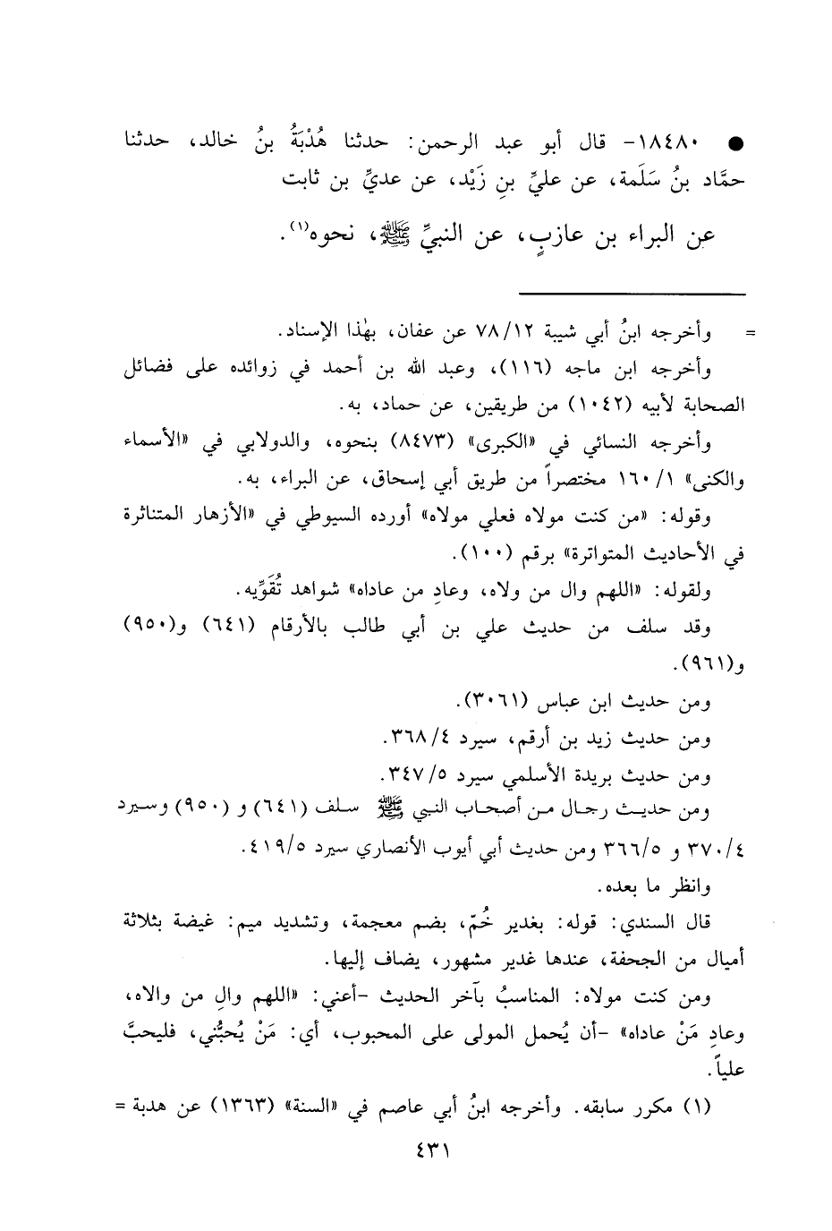 • ١٨٤٨٠ - قَالَ أَبُو عَبْدِ الرَّحْمَنِ: حَدَّثَنَا، هُدْبَةُ بْنُ خَالِدٍ، حَدَّثَنَا حَمَّادُ بْنُ سَلَمَةَ، عَنْ عَلِيِّ بْنِ زَيْدٍ، عَنْ عَدِيِّ بْنِ ثَابِتٍ، عَنِ الْبَرَاءِ بْنِ عَازِبٍ، عَنِ النَّبِيِّ صَلَّى اللهُ عَلَيْهِ وَسَلَّمَ نَحْوَهُ (١)
