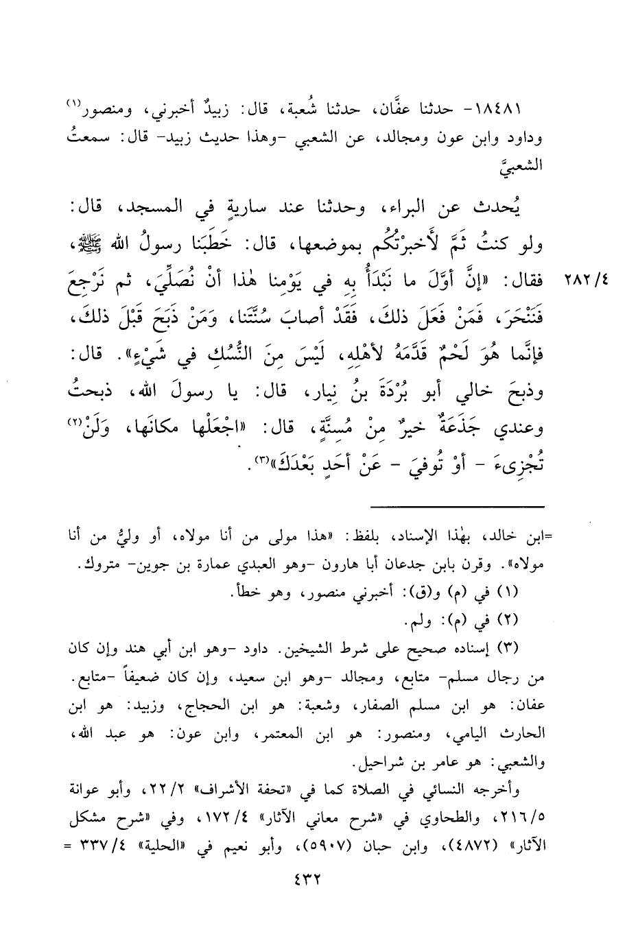 ١٨٤٨١ - حَدَّثَنَا عَفَّانُ، حَدَّثَنَا شُعْبَةُ، قَالَ: زُبَيْدٌ، أَخْبَرَنِي مَنْصُورٌ، (١) وَدَاوُدُ، وَابْنُ عَوْنٍ، وَمُجَالِدٌ، عَنِ الشَّعْبِيِّ، وَهَذَا حَدِيثُ زُبَيْدٍ، قَالَ: سَمِعْتُ الشَّعْبِيَّ، يُحَدِّثُ عَنِ الْبَرَاءِ، وَحَدَّثَنَا عِنْدَ سَارِيَةٍ فِي الْمَسْجِدِ، قَالَ: وَلَوْ كُنْتُ ثَمَّ لَأَخْبَرْتُكُمْ بِمَوْضِعِهَا، قَالَ: خَطَبَنَا رَسُولُ اللهِ صَلَّى اللهُ عَلَيْهِ وَسَلَّمَ، فَقَالَ: " إِنَّ أَوَّلَ مَا نَبْدَأُ بِهِ فِي يَوْمِنَا هَذَا أَنْ نُصَلِّيَ، ثُمَّ نَرْجِعَ فَنَنْحَرَ، فَمَنْ فَعَلَ ذَلِكَ، فَقَدْ أَصَابَ سُنَّتَنَا، وَمَنْ ذَبَحَ قَبْلَ ذَلِكَ، فَإِنَّمَا هُوَ لَحْمٌ قَدَّمَهُ لِأَهْلِهِ لَيْسَ مِنَ النُّسُكِ فِي شَيْءٍ " قَالَ: وَذَبَحَ خَالِي أَبُو بُرْدَةَ بْنُ نِيَارٍ، قَالَ: يَا رَسُولَ اللهِ ذَبَحْتُ وَعِنْدِي جَذَعَةٌ خَيْرٌ مِنْ مُسِنَّةٍ، قَالَ: " اجْعَلْهَا مَكَانَهَا، وَلَنْ (٢) تُجْزِئَ، - أَوْ تُوفِي - عَنْ أَحَدٍ بَعْدَكَ " (٣)