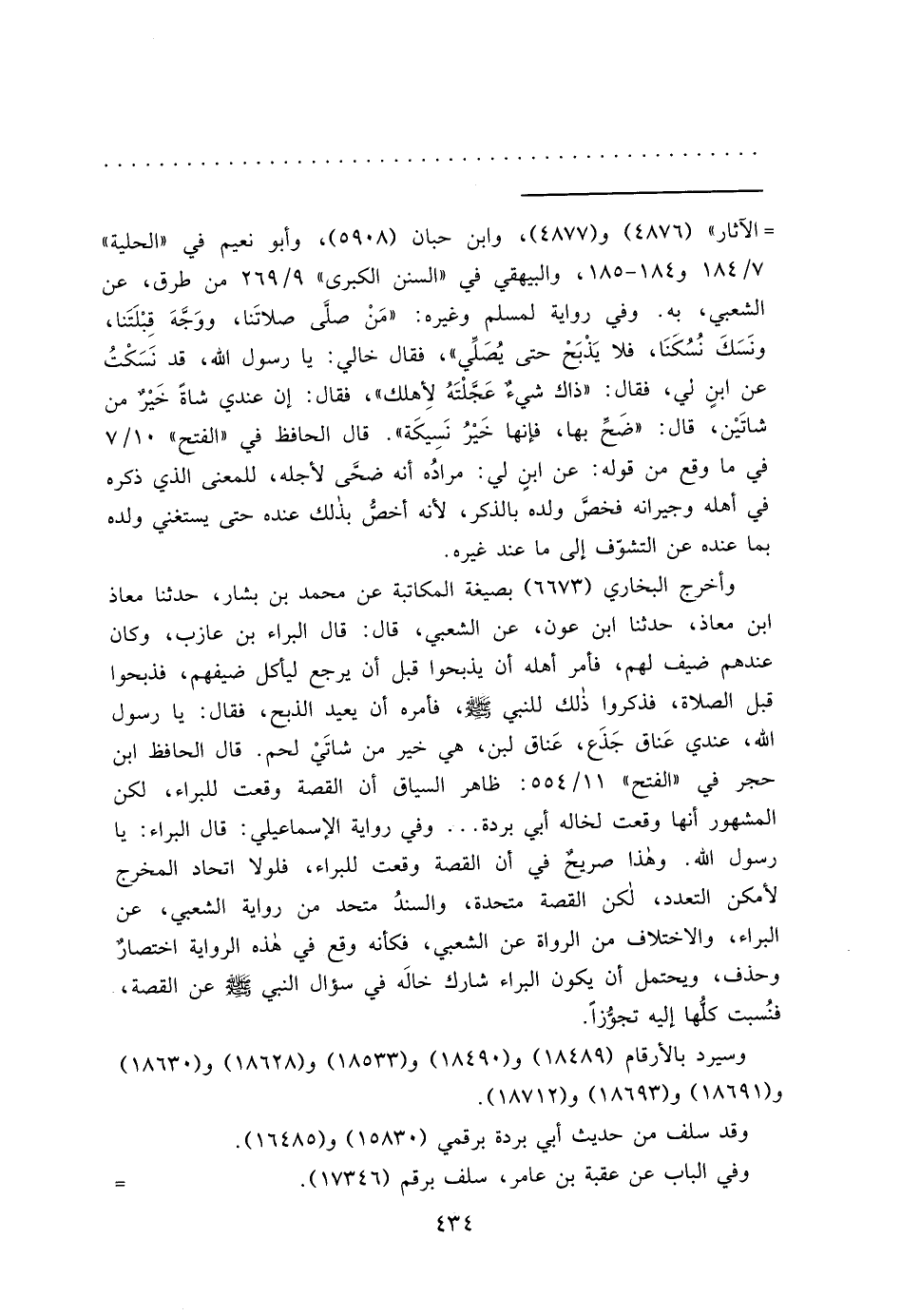 = الآثار" (٤٨٧٦) و (٤٨٧٧) ، وابن حبان (٥٩٠٨) ، وأبو نعيم في "الحلية" ٧/١٨٤ و١٨٤-١٨٥، والبيهقي في "السنن الكبرى" ٩/٢٦٩ من طرق، عن الشعبي، به. وفي رواية لمسلم وغيره: "مَنْ صلََّى صلاتَنا، ووَجَّهَ قِبْلَتَنا، ونَسَكَ نُسُكَنَا، فلا يَذْبَحْ حتى يُصَلَّي"، فقال خالي: يا رسول الله، قد نَسَكْتُ عن ابنٍ لي، فقال: "ذاك شيءٌ عَجَّلْتَهُ لأِهلك"، فقال: إن عندي شاةً خَيْرٌ من شاتَيْن، قال: "ضَحِّ بها، فإنها خَيْرُ نَسِيكَة". قال الحافظ في "الفتح" ١٠/٧ في ما وقع من قوله: عن ابنٍ لي: مرادُه أنه ضحَّى لأجله، للمعنى الذي ذكره في أهله وجيرانه فخصَّ ولده بالذكر، لأنه أخصُّ بذلك عنده حتى يستغني ولده بما عنده عن التشوّف إلى ما عند غيره.