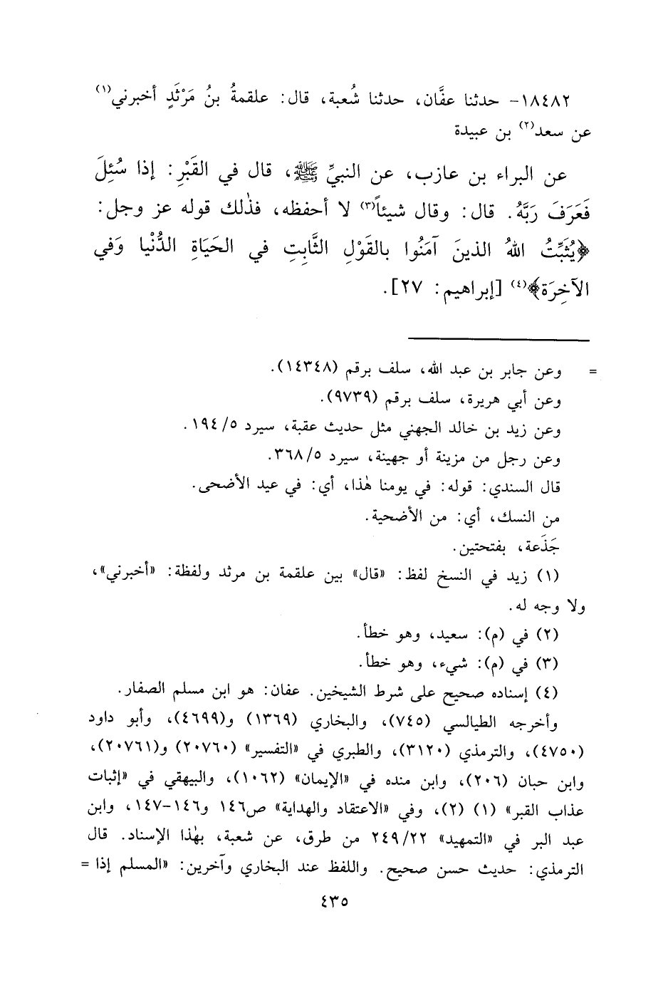 ١٨٤٨٢ - حَدَّثَنَا عَفَّانُ، حَدَّثَنَا شُعْبَةُ، قَالَ: عَلْقَمَةُ بْنُ مَرْثَدٍ، أَخْبَرَنِي (١) عَنْ سَعْدِ (٢) بْنِ عُبَيْدَةَ، عَنِ الْبَرَاءِ بْنِ عَازِبٍ، أَنَّ النَّبِيَّ صَلَّى اللهُ عَلَيْهِ وَسَلَّمَ، قَالَ فِي الْقَبْرِ: " إِذَا سُئِلَ فَعَرَفَ رَبَّهُ "، قَالَ: وَقَالَ شَيْئًا (٣) لَا أَحْفَظُهُ، فَذَلِكَ قَوْلُهُ عَزَّ وَجَلَّ: {يُثَبِّتُ اللهُ الَّذِينَ آمَنُوا بِالْقَوْلِ الثَّابِتِ فِي الْحَيَاةِ الدُّنْيَا وَفِي الْآخِرَةِ} (٤) [إبراهيم: ٢٧]