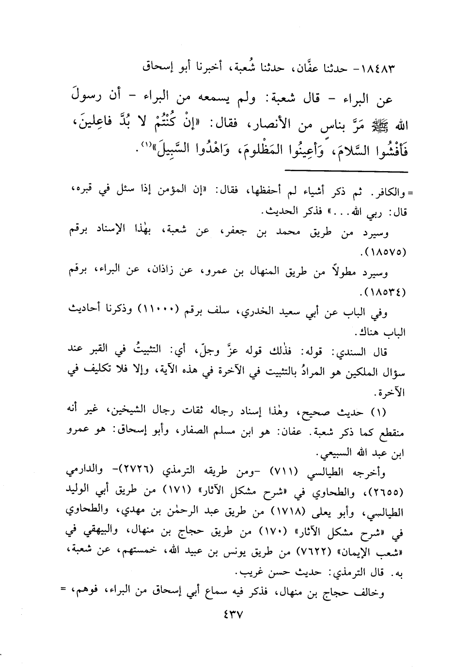 ١٨٤٨٣ - حَدَّثَنَا عَفَّانُ، حَدَّثَنَا شُعْبَةُ، أَخْبَرَنَا أَبُو إِسْحَاقَ، عَنِ الْبَرَاءِ، قَالَ شُعْبَةُ وَلَمْ يَسْمَعْهُ مِنَ الْبَرَاءِ، أَنَّ رَسُولَ اللهِ صَلَّى اللهُ عَلَيْهِ وَسَلَّمَ مَرَّ بِنَاسٍ مِنَ الْأَنْصَارِ، فَقَالَ: " إِنْ كُنْتُمْ لَا بُدَّ فَاعِلِينَ، فَأَفْشُوا السَّلَامَ، وَأَعِينُوا الْمَظْلُومَ، وَاهْدُوا السَّبِيلَ " (١)