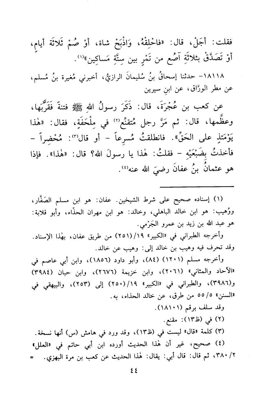 ١٨١١٨ - حَدَّثَنَا إِسْحَاقُ بْنُ سُلَيْمَانَ الرَّازِيُّ، أَخْبَرَنِي مُغِيرَةُ بْنُ مُسْلِمٍ، عَنْ مَطَرٍ الْوَرَّاقِ، عَنِ ابْنِ سِيرِينَ، عَنْ كَعْبِ بْنِ عُجْرَةَ، قَالَ: ذَكَرَ رَسُولُ اللهِ صَلَّى اللهُ عَلَيْهِ وَسَلَّمَ فِتْنَةً فَقَرَّبَهَا، وَعَظَّمَهَا، قَالَ: ثُمَّ مَرَّ رَجُلٌ مُتَقَنِّعٌ (٢) فِي مِلْحَفَةٍ، فَقَالَ: " هَذَا يَوْمَئِذٍ عَلَى الْحَقِّ " فَانْطَلَقْتُ مُسْرِعًا، أَوْ قَالَ: (٣) مُحْضِرًا، فَأَخَذْتُ بِضَبْعَيْهِ، فَقُلْتُ: هَذَا يَا رَسُولَ اللهِ؟ قَالَ: " هَذَا " فَإِذَا هُوَ عُثْمَانُ بْنُ عَفَّانَ رَضِيَ اللهُ عَنْهُ (٤)