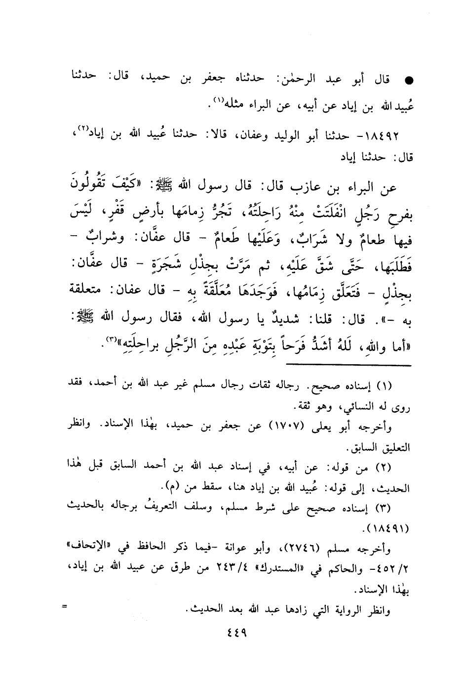 ١٨٤٩٢ - حَدَّثَنَا أَبُو الْوَلِيدِ، وَعَفَّانُ، قَالَا: حَدَّثَنَا عُبَيْدُ اللهِ بْنُ إِيَادٍ، (٢) قَالَ: حَدَّثَنَا إِيَادٌ، عَنِ الْبَرَاءِ بْنِ عَازِبٍ، قَالَ: قَالَ رَسُولُ اللهِ صَلَّى اللهُ عَلَيْهِ وَسَلَّمَ: " كَيْفَ تَقُولُونَ بِفَرَحِ رَجُلٍ انْفَلَتَتْ مِنْهُ رَاحِلَتُهُ، تَجُرُّ زِمَامَهَا بِأَرْضٍ قَفْرٍ لَيْسَ فِيهَا طَعَامٌ وَلَا شَرَابٌ، وَعَلَيْهَا طَعَامٌ، قَالَ عَفَّانُ: وَشَرَابٌ، فَطَلَبَهَا حَتَّى شَقَّ عَلَيْهِ، ثُمَّ مَرَّتْ بِجِذْلِ شَجَرَةٍ، قَالَ عَفَّانُ: بِجِذْلٍ، فَتَعَلَّقَ زِمَامُهَا، فَوَجَدَهَا مُعَلَّقَةً بِهِ،، قَالَ عَفَّانُ: مُتَعَلِّقَةً بِهِ، "، قَالَ: قُلْنَا شَدِيدٌ يَا رَسُولَ اللهِ، فَقَالَ رَسُولُ اللهِ صَلَّى اللهُ عَلَيْهِ وَسَلَّمَ: " أَمَا وَاللهِ، لَلَّهُ أَشَدُّ فَرَحًا بِتَوْبَةِ عَبْدِهِ مِنَ الرَّجُلِ بِرَاحِلَتِهِ " (٣)
