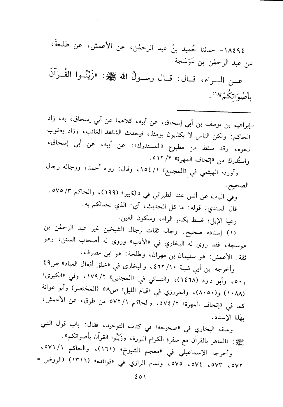 ١٨٤٩٤ - حَدَّثَنَا حُمَيْدُ بْنُ عَبْدِ الرَّحْمَنِ، عَنِ الْأَعْمَشِ، عَنْ طَلْحَةَ، عَنْ عَبْدِ الرَّحْمَنِ بْنِ عَوْسَجَةَ، عَنِ الْبَرَاءِ، قَالَ: قَالَ رَسُولُ اللهِ صَلَّى اللهُ عَلَيْهِ وَسَلَّمَ: " زَيِّنُوا الْقُرْآنَ بِأَصْوَاتِكُمْ " (١)