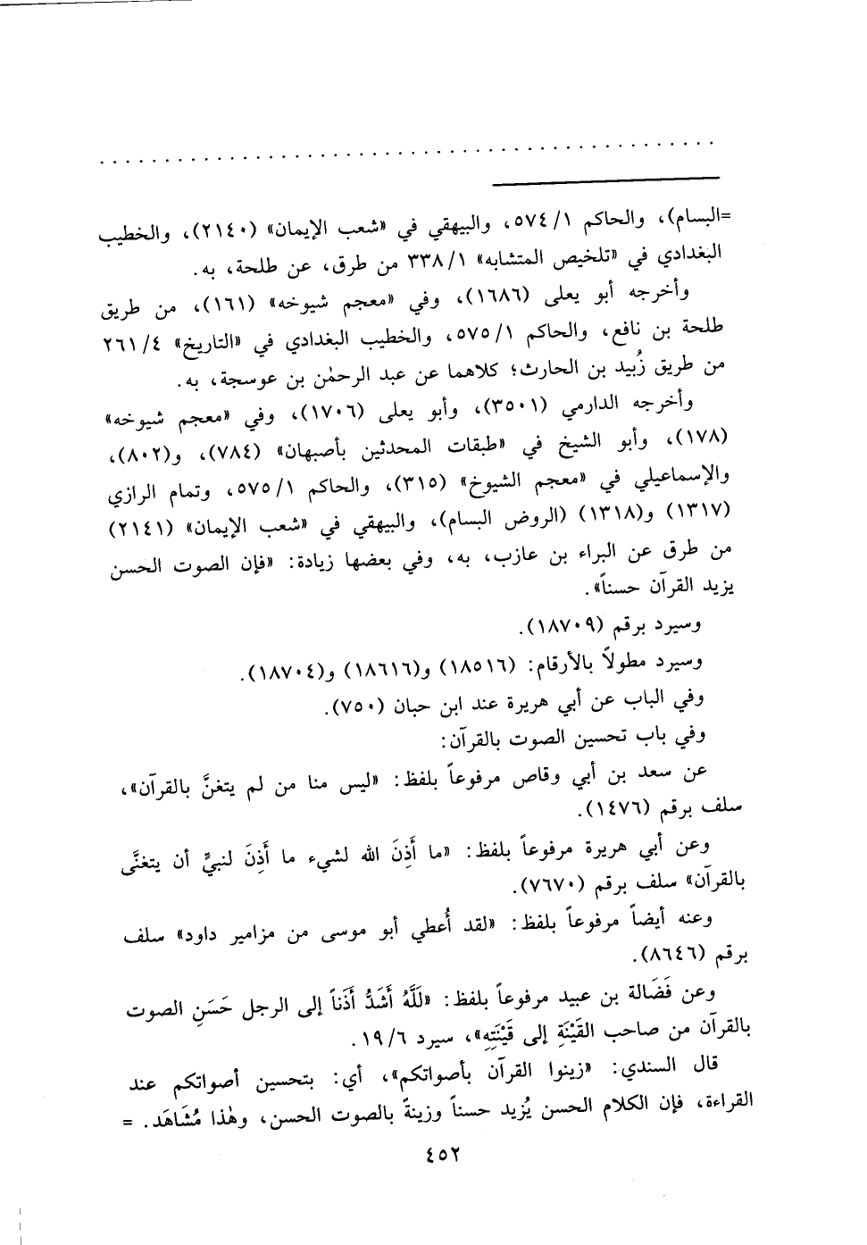 وعن أبي هريرة مرفوعاً بلفظ: "ما أَذِنَ الله لشيء ما أَذنَ لنبيٍّ أن يتغنَّى بالقرآن" سلف برقم (٧٦٧٠) .