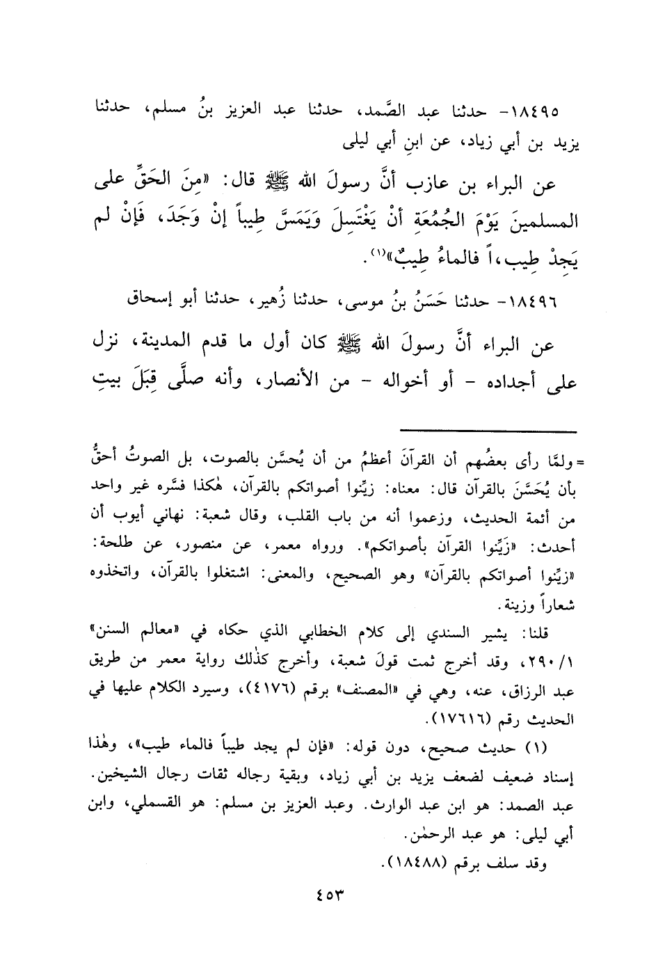 ١٨٤٩٥ - حَدَّثَنَا عَبْدُ الصَّمَدِ، حَدَّثَنَا عَبْدُ الْعَزِيزِ بْنُ مُسْلِمٍ، حَدَّثَنَا يَزِيدُ بْنُ أَبِي زِيَادٍ، عَنِ ابْنِ أَبِي لَيْلَى، عَنِ الْبَرَاءِ بْنِ عَازِبٍ، أَنَّ رَسُولَ اللهِ صَلَّى اللهُ عَلَيْهِ وَسَلَّمَ، قَالَ: " مِنَ الْحَقِّ عَلَى الْمُسْلِمِينَ يَوْمَ الْجُمُعَةِ أَنْ يَغْتَسِلَ، وَيَمَسَّ طِيبًا إِنْ وَجَدَ، فَإِنْ لَمْ يَجِدْ طِيبًا، فَالْمَاءُ طِيبٌ " (١)