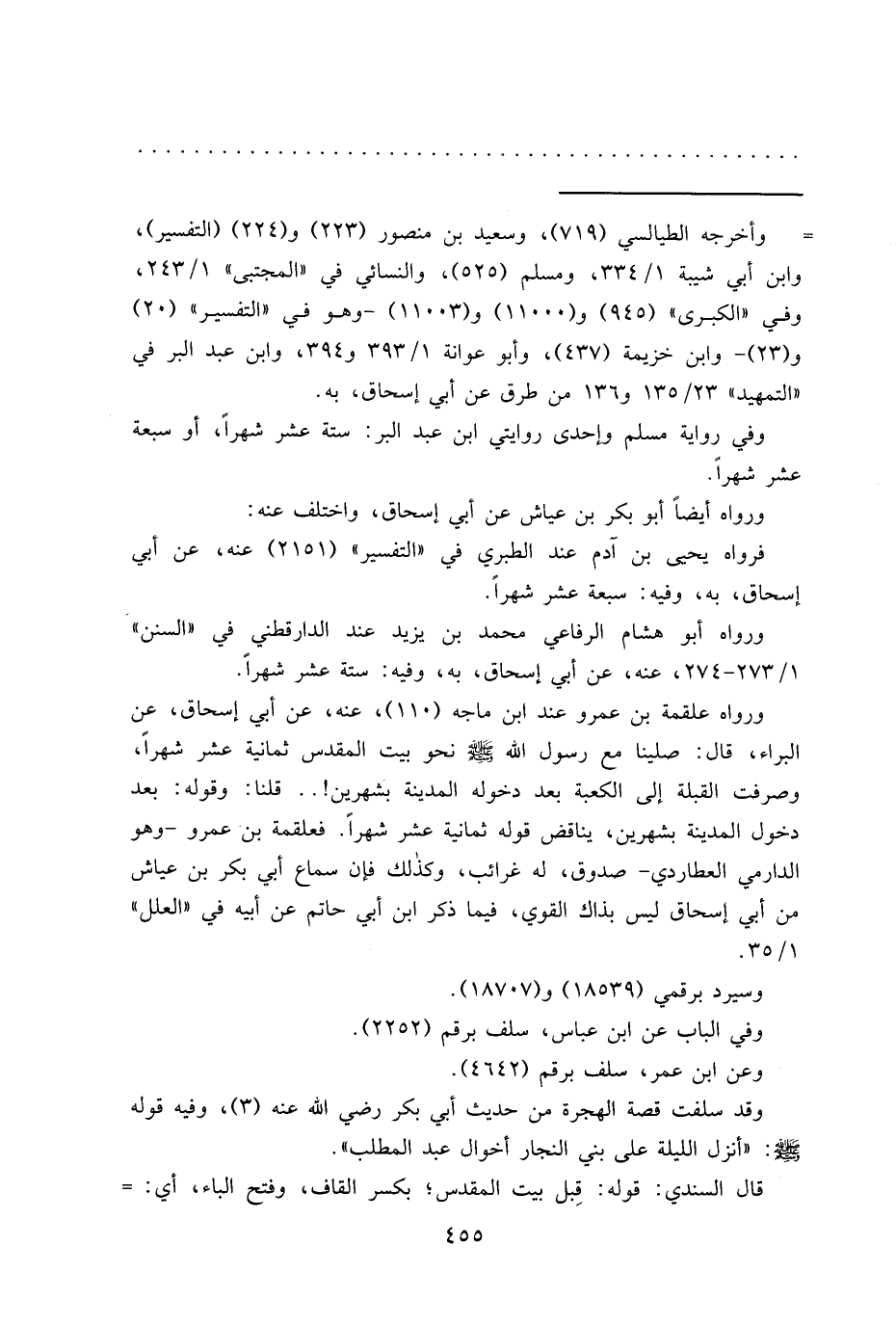 ورواه علقمة بن عمرو عند ابن ماجه (١١٠) ، عنه، عن أبي إسحاق، عن البراء، قال: صلينا مع رسول الله صلي الله عليه وسلم نحو بيت المقدس ثمانية عشر شهراً، وصرفت القبلة إلى الكعبة بعد دخوله المدينة بشهرين!.. قلنا: وقوله: بعد دخول المدينة بشهرين، يناقض قوله ثمانية عشر شهراً. فعلقمة بن عمرو- وهو الدارمي العطاردي- صدوق، له غرائب، وكذلك فإن سماع أبي بكر بن عياش من أبي إسحاق ليس بذاك القوي، فيما ذكر ابن أبي حاتم عن أبيه في "العلل" ١/٣٥.