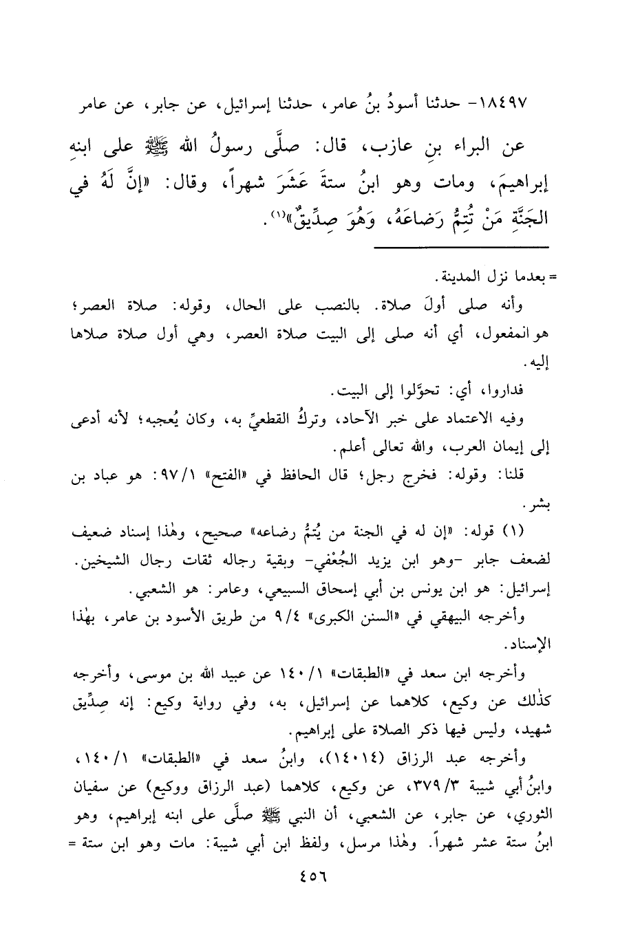 ١٨٤٩٧ - حَدَّثَنَا أَسْوَدُ بْنُ عَامِرٍ، حَدَّثَنَا إِسْرَائِيلُ، عَنْ جَابِرٍ، عَنْ عَامِرٍ، عَنْ الْبَرَاءِ بْنِ عَازِبٍ، قَالَ: صَلَّى رَسُولُ اللهِ صَلَّى اللهُ عَلَيْهِ وَسَلَّمَ عَلَى ابْنِهِ إِبْرَاهِيمَ وَمَاتَ، وَهُوَ ابْنُ سِتَّةَ عَشَرَ شَهْرًا، وَقَالَ: " إِنَّ لَهُ فِي الْجَنَّةِ مَنْ تُتِمُّ رَضَاعَهُ وَهُوَ صِدِّيقٌ " (١)