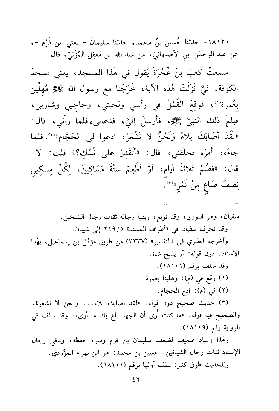 ١٨١٢٠ - حَدَّثَنَا حُسَيْنُ بْنُ مُحَمَّدٍ، حَدَّثَنَا سُلَيْمَانُ يَعْنِي ابْنَ قَرْمٍ، عَنْ عَبْدِ الرَّحْمَنِ بْنِ الْأَصْبَهَانِيِّ، عَنْ عَبْدِ اللهِ بْنِ مَعْقِلٍ الْمُزَنِيِّ، قَالَ: سَمِعْتُ كَعْبَ بْنَ عُجْرَةَ يَقُولُ: فِي هَذَا الْمَسْجِدِ، يَعْنِي مَسْجِدَ الْكُوفَةِ، فِيَّ نَزَلَتْ هَذِهِ الْآيَةُ، خَرَجْنَا مَعَ رَسُولِ اللهِ صَلَّى اللهُ عَلَيْهِ وَسَلَّمَ، مُهِلِّينَ بِعُمْرَةٍ، (١) فَوَقَعَ الْقَمْلُ فِي رَأْسِي، وَلِحْيَتِي، وَحَاجِبَيَّ، وَشَارِبِي، فَبَلَغَ ذَلِكَ النَّبِيَّ صَلَّى اللهُ عَلَيْهِ وَسَلَّمَ، فَأَرْسَلَ إِلَيَّ، فَدَعَانِي، فَلَمَّا رَآنِي قَالَ: " لَقَدْ أَصَابَكَ بَلَاءٌ، وَنَحْنُ لَا نَشْعُرُ ادْعُوا لِي الْحَجَّامَ " (٢) فَلَمَّا جَاءَهُ أَمَرَهُ، فَحَلَقَنِي، قَالَ: " أَتَقْدِرُ عَلَى نُسُكٍ؟ " قُلْتُ: لَا، قَالَ: " فَصُمْ ثَلَاثَةَ أَيَّامٍ، أَوْ أَطْعِمْ سِتَّةَ مَسَاكِينَ، لِكُلِّ مِسْكِينٍ نِصْفُ صَاعٍ مِنْ تَمْرٍ " (٣)