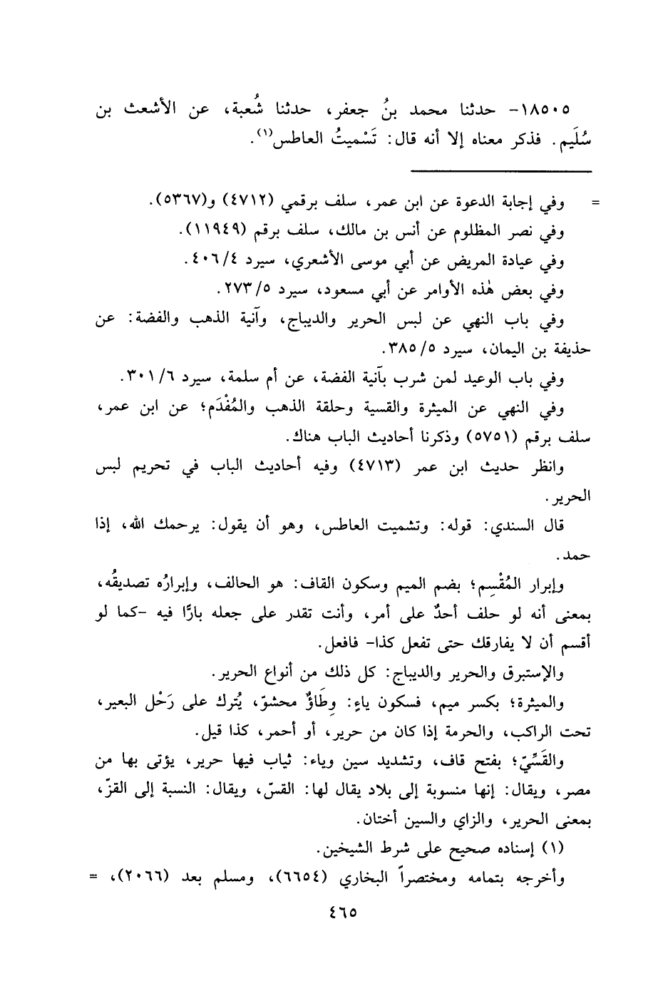 ١٨٥٠٥ - حَدَّثَنَا مُحَمَّدُ بْنُ جَعْفَرٍ، حَدَّثَنَا شُعْبَةُ، عَنِ الْأَشْعَثِ بْنِ سُلَيْمٍ فَذَكَرَ مَعْنَاهُ إِلَّا أَنَّهُ قَالَ: " تَسْمِيتِ الْعَاطِسِ " (١)