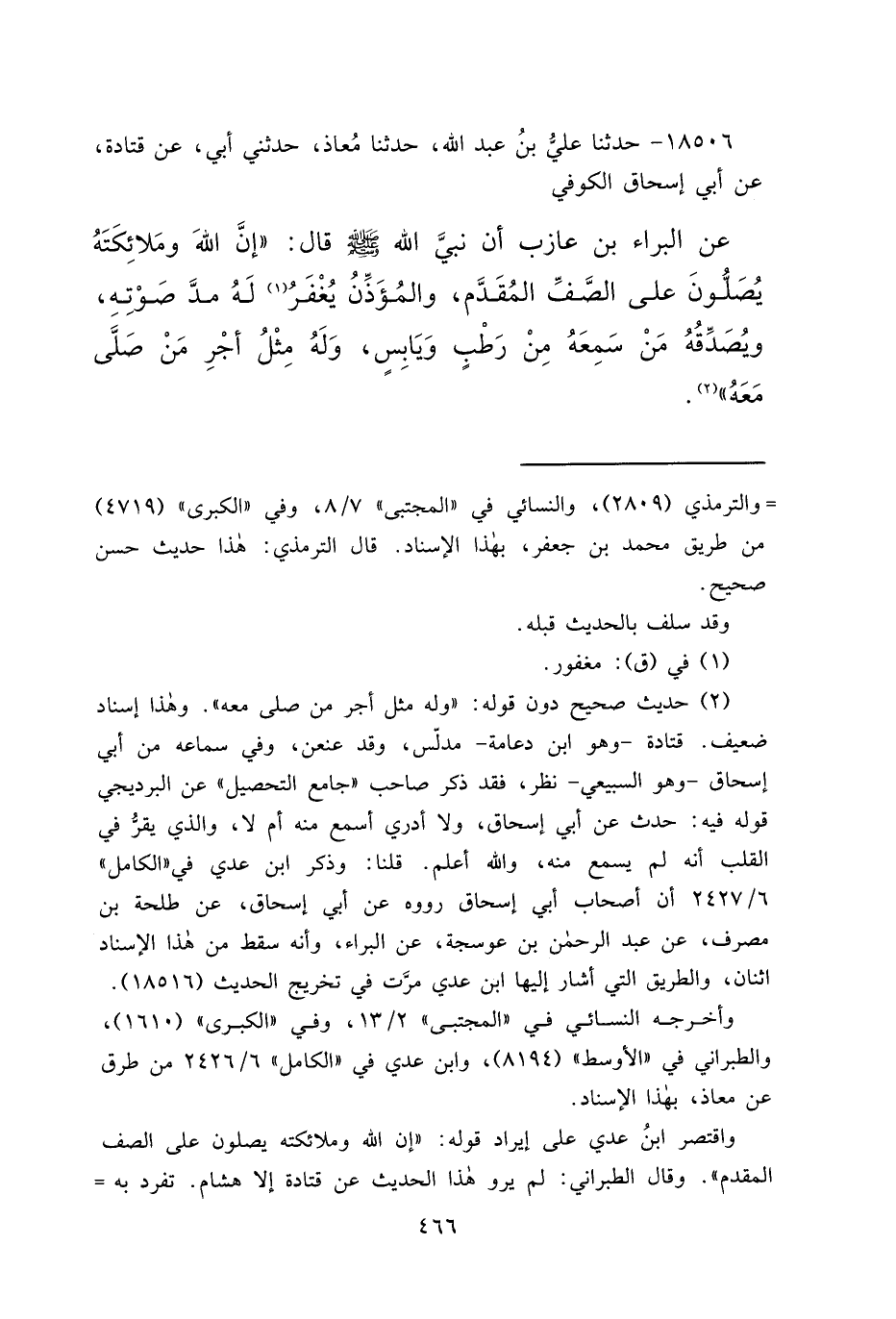 ١٨٥٠٦ - حَدَّثَنَا عَلِيُّ بْنُ عَبْدِ اللهِ، حَدَّثَنَا مُعَاذٌ، حَدَّثَنِي أَبِي، عَنْ قَتَادَةَ، عَنْ أَبِي إِسْحَاقَ الْكُوفِيِّ، عَنِ الْبَرَاءِ بْنِ عَازِبٍ، أَنَّ نَبِيَّ اللهِ صَلَّى اللهُ عَلَيْهِ وَسَلَّمَ، قَالَ: " إِنَّ اللهَ وَمَلَائِكَتَهُ يُصَلُّونَ عَلَى الصَّفِّ الْمُقَدَّمِ، وَالْمُؤَذِّنُ يُغْفَرُ (١) لَهُ مَدَّ صَوْتِهِ، وَيُصَدِّقُهُ مَنْ سَمِعَهُ مِنْ رَطْبٍ وَيَابِسٍ، وَلَهُ مِثْلُ أَجْرِ مَنْ صَلَّى مَعَهُ " (٢)