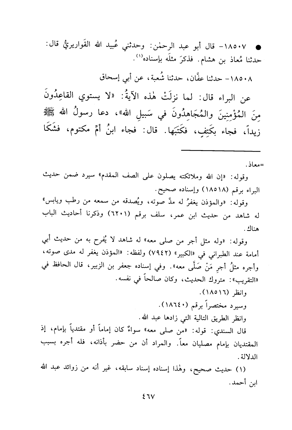• ١٨٥٠٧ - قَالَ أَبُو عَبْدِ الرَّحْمَنِ: وحَدَّثَنِي، عُبَيْدُ اللهِ الْقَوَارِيرِيُّ، قَالَ: حَدَّثَنَا مُعَاذُ بْنُ هِشَامٍ فَذَكَرَ مِثْلَهُ بِإِسْنَادِهِ (١)