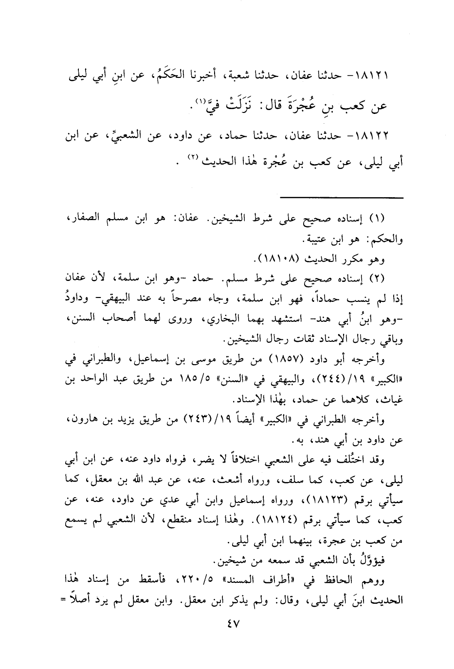 وقد اختُلف فيه على الشعبي اختلافاً لا يضر، فرواه داود عنه، عن ابن أبي ليلى، عن كعب، كما سلف، ورواه أشعث، عنه، عن عبد الله بن معقل، كما سيأتي برقم (١٨١٢٣) ، ورواه إسماعيل وابن أبي عدي عن داود، عنه، عن كعب، كما سيأتي برقم (١٨١٢٤) . وهذا إسناد منقطع، لأن الشعبي لم يسمع من كعب بن عجرة، بينهما ابن أبي ليلى.