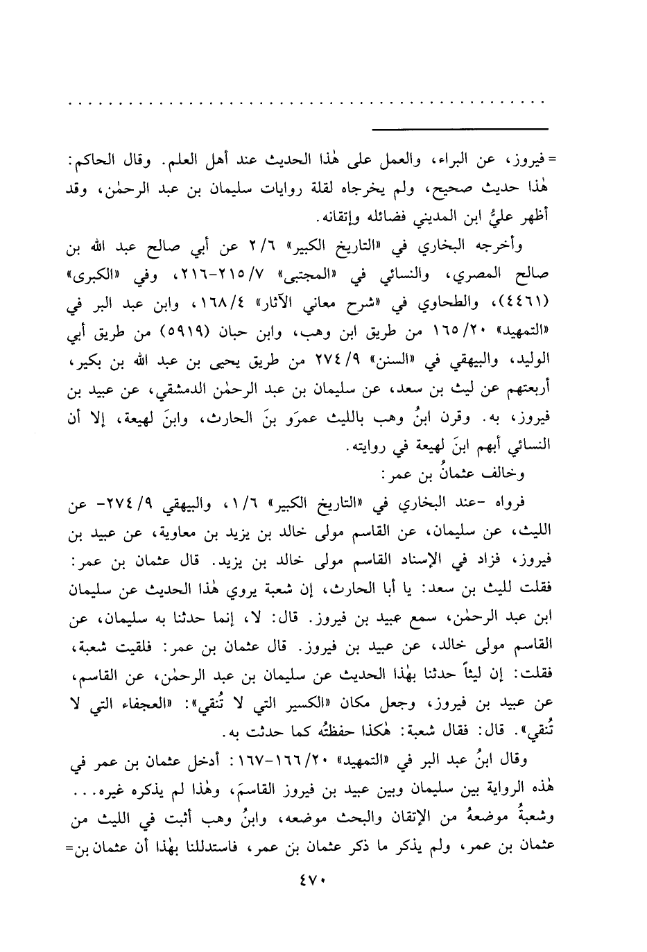وقال ابنُ عبد البر في "التمهيد" ٢٠/٦٦ ا-١٦٧: أدخل عثمان بن عمر في هذه الرواية بين سليمان وبين عبيد بن فيروز القاسمَ، وهذا لم يذكره غيره ...