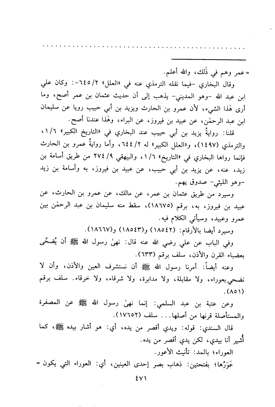 وعنه أيضاً: أمرنا رسول الله صَلَّى اللهُ عَلَيْهِ وَسَلَّمَ أن نستشرف العين والأذن، وأن لا نضحي بعوراء، ولا مقابلة، ولا مدابرة، ولا شرقاء، ولا خرقاء. سلف برقم (٨٥١) .