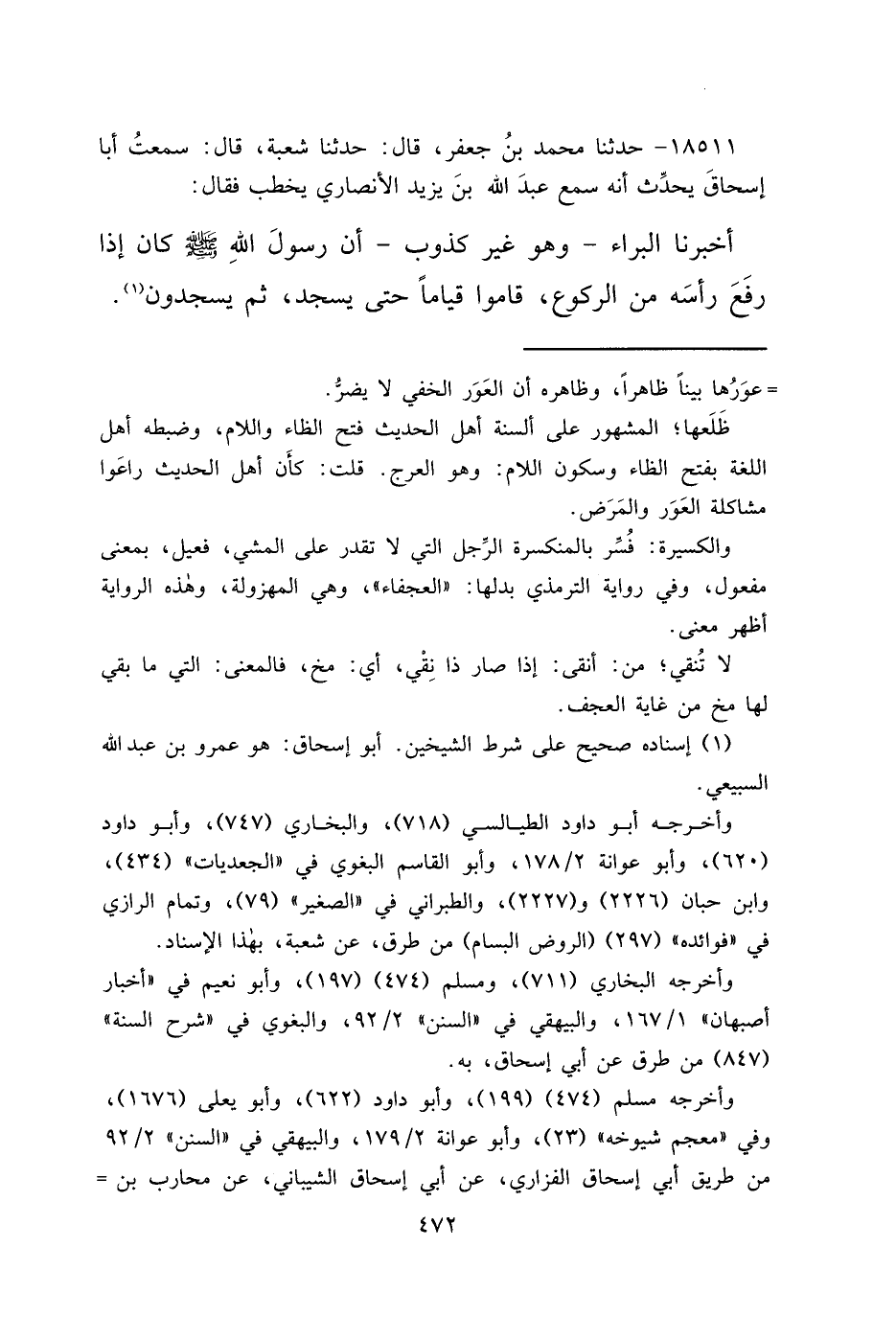 ١٨٥١١ - حَدَّثَنَا مُحَمَّدُ بْنُ جَعْفَرٍ قَالَ: حَدَّثَنَا شُعْبَةُ قَالَ: سَمِعْتُ أَبَا إِسْحَاقَ، يُحَدِّثُ أَنَّهُ سَمِعَ عَبْدَ اللهِ بْنَ يَزِيدَ الْأَنْصَارِيَّ يَخْطُبُ فَقَالَ: أَخْبَرَنَا الْبَرَاءُ، وَهُوَ غَيْرُ كَذُوبٍ، " أَنَّ رَسُولَ اللهِ صَلَّى اللهُ عَلَيْهِ وَسَلَّمَ كَانَ إِذَا رَفَعَ رَأْسَهُ مِنَ الرُّكُوعِ قَامُوا قِيَامًا حَتَّى يَسْجُدَ، ثُمَّ يَسْجُدُونَ " (١)