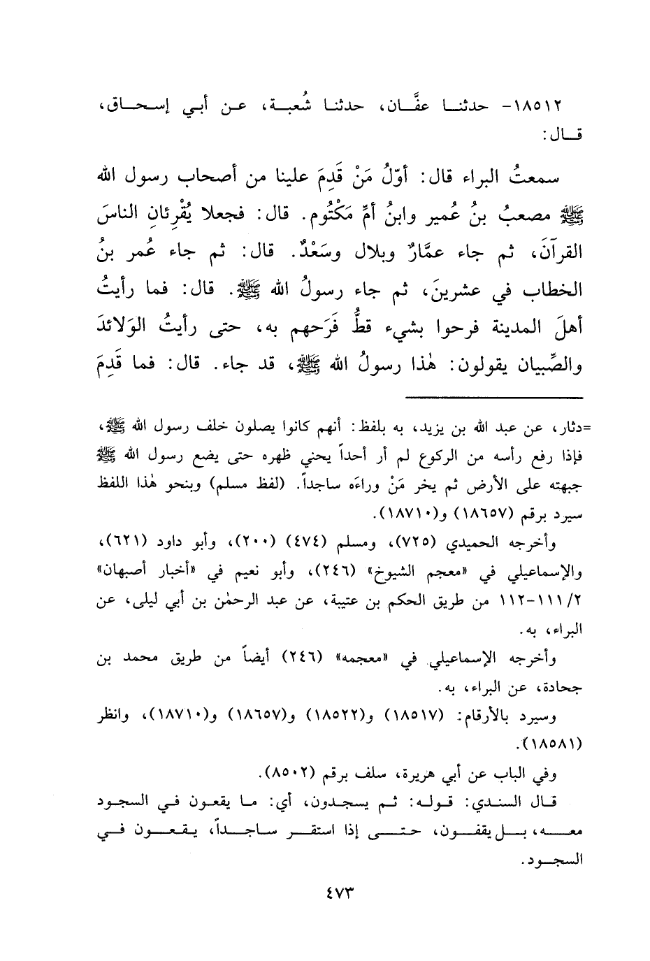 ١٨٥١٢ - حَدَّثَنَا عَفَّانُ، حَدَّثَنَا شُعْبَةُ، عَنْ أَبِي إِسْحَاقَ، قَالَ: سَمِعْتُ الْبَرَاءَ، قَالَ: أَوَّلُ مَنْ قَدِمَ عَلَيْنَا مِنْ أَصْحَابِ رَسُولِ اللهِ صَلَّى اللهُ عَلَيْهِ وَسَلَّمَ مُصْعَبُ بْنُ عُمَيْرٍ، وَابْنُ أُمِّ مَكْتُومٍ، قَالَ: فَجَعَلَا يُقْرِئَانِ النَّاسَ الْقُرْآنَ، ثُمَّ جَاءَ عَمَّارٌ، وَبِلَالٌ، وَسَعْدٌ. قَالَ: ثُمَّ جَاءَ عُمَرُ بْنُ الْخَطَّابِ فِي عِشْرِينَ، " ثُمَّ جَاءَ رَسُولُ اللهِ صَلَّى اللهُ عَلَيْهِ وَسَلَّمَ، فَمَا رَأَيْتُ أَهْلَ الْمَدِينَةِ فَرِحُوا بِشَيْءٍ قَطُّ فَرَحَهُمْ بِهِ "، حَتَّى رَأَيْتُ الْوَلَائِدَ وَالصِّبْيَانَ يَقُولُونَ: هَذَا رَسُولُ اللهِ صَلَّى اللهُ عَلَيْهِ وَسَلَّمَ قَدْ جَاءَ. قَالَ: فَمَا قَدِمَ