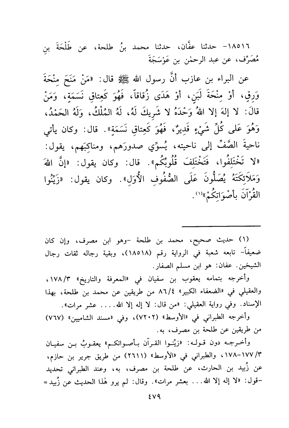 ١٨٥١٦ - حَدَّثَنَا عَفَّانُ، حَدَّثَنَا مُحَمَّدُ بْنُ طَلْحَةَ، عَنْ طَلْحَةَ بْنِ مُصَرِّفٍ، عَنْ عَبْدِ الرَّحْمَنِ بْنِ عَوْسَجَةَ، عَنِ الْبَرَاءِ بْنِ عَازِبٍ، أَنَّ رَسُولَ اللهِ صَلَّى اللهُ عَلَيْهِ وَسَلَّمَ، قَالَ: " مَنْ مَنَحَ مِنْحَةَ وَرِقٍ، أَوْ مِنْحَةَ لَبَنٍ، أَوْ هَدَى زُقَاقًا فَهُوَ كَعِتَاقِ نَسَمَةٍ. وَمَنْ قَالَ لَا إِلَهَ إِلَّا اللهُ وَحْدَهُ لَا شَرِيكَ لَهُ، لَهُ الْمُلْكُ، وَلَهُ الْحَمْدُ، وَهُوَ عَلَى كُلِّ شَيْءٍ قَدِيرٌ فَهُوَ كَعِتَاقِ نَسَمَةٍ "