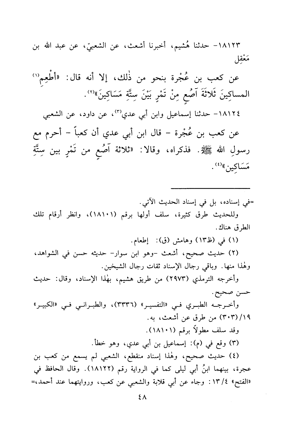 (٤) حديث صحيح، وهذا إسناد منقطع، الشعبي لم يسمع من كعب بن عجرة، بينهما ابنُ أبي ليلى كما في الرواية رقم (١٨١٢٢) . وقال الحافظ في "الفتح" ٤/١٣: وجاء عن أبي قلابة والشعبي عن كعب، وروايتهما عند أحمد،=