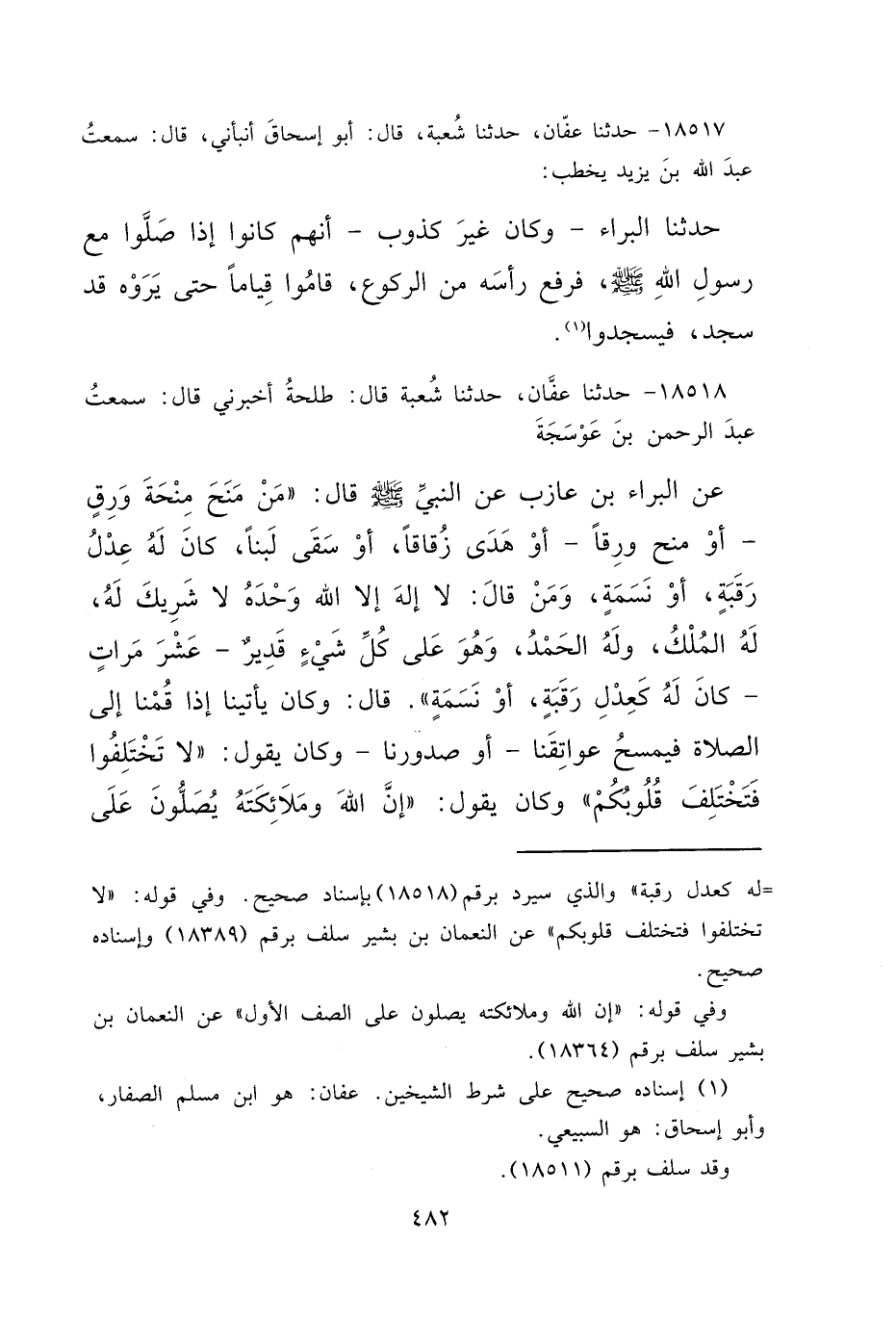 ١٨٥١٧ - حَدَّثَنَا عَفَّانُ، حَدَّثَنَا شُعْبَةُ، قَالَ: أَبُو إِسْحَاقَ أَنْبَأَنِي، قَالَ: سَمِعْتُ عَبْدَ اللهِ بْنَ يَزِيدَ، يَخْطُبُ: حَدَّثَنَا الْبَرَاءُ، وَكَانَ غَيْرَ كَذُوبٍ، " أَنَّهُمْ كَانُوا إِذَا صَلَّوْا مَعَ رَسُولِ اللهِ صَلَّى اللهُ عَلَيْهِ وَسَلَّمَ، فَرَفَعَ رَأْسَهُ مِنَ الرُّكُوعِ، قَامُوا قِيَامًا حَتَّى يَرَوْهُ قَدْ سَجَدَ، فَيَسْجُدُوا " (١)