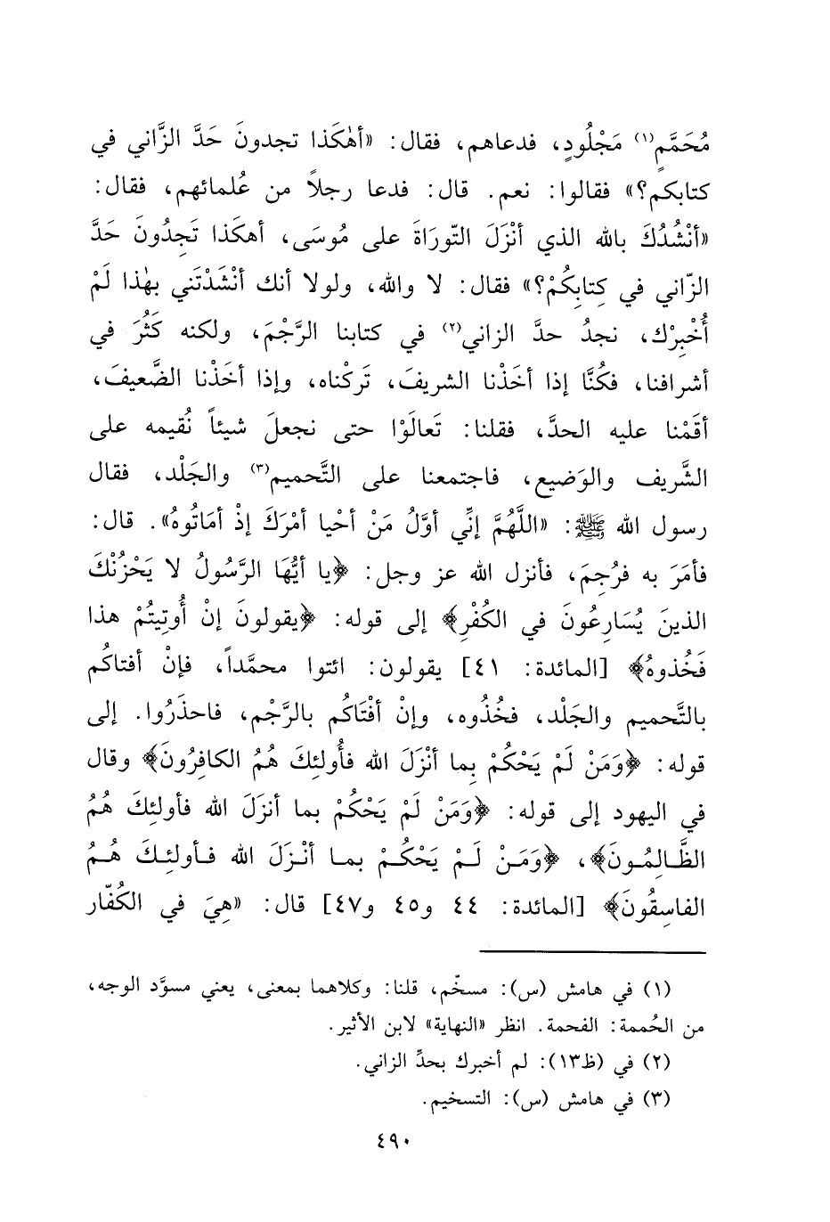 مُحَمَّمٍ (١) مَجْلُودٍ، فَدَعَاهُمْ، فَقَالَ: " أَهَكَذَا تَجِدُونَ حَدَّ الزَّانِي فِي كِتَابِكُمْ؟ " فَقَالُوا: نَعَمْ. قَالَ: فَدَعَا رَجُلًا مِنْ عُلَمَائِهِمْ، فَقَالَ: " أَنْشُدُكَ بِاللهِ الَّذِي أَنْزَلَ التَّوْرَاةَ عَلَى مُوسَى، أَهَكَذَا تَجِدُونَ حَدَّ الزَّانِي فِي كِتَابِكُمْ؟ " فَقَالَ: لَا وَاللهِ، وَلَوْلَا أَنَّكَ أَنْشَدْتَنِي بِهَذَا لَمْ أُخْبِرْكَ، نَجِدُ حَدَّ الزَّانِي (٢) فِي كِتَابِنَا الرَّجْمَ، وَلَكِنَّهُ كَثُرَ فِي أَشْرَافِنَا، فَكُنَّا إِذَا أَخَذْنَا الشَّرِيفَ، تَرَكْنَاهُ، وَإِذَا أَخَذْنَا الضَّعِيفَ، أَقَمْنَا عَلَيْهِ الْحَدَّ، فَقُلْنَا: تَعَالَوْا حَتَّى نَجْعَلَ شَيْئًا نُقِيمُهُ عَلَى الشَّرِيفِ وَالْوَضِيعِ، فَاجْتَمَعْنَا عَلَى التَّحْمِيمِ (٣) وَالْجَلْدِ، فَقَالَ رَسُولُ اللهِ صَلَّى اللهُ عَلَيْهِ وَسَلَّمَ: " اللهُمَّ إِنِّي أَوَّلُ مَنْ أَحْيَا أَمْرَكَ إِذْ أَمَاتُوهُ " قَالَ: فَأَمَرَ بِهِ فَرُجِمَ، فَأَنْزَلَ اللهُ عَزَّ وَجَلَّ: {يَا أَيُّهَا الرَّسُولُ لَا يَحْزُنْكَ الَّذِينَ يُسَارِعُونَ فِي الْكُفْرِ} [المائدة: ٤١] إِلَى قَوْلِهِ: {يَقُولُونَ إِنْ أُوتِيتُمْ هَذَا فَخُذُوهُ} [المائدة: ٤١] يَقُولُونَ: ائْتُوا مُحَمَّدًا فَإِنْ أَفْتَاكُمْ بِالتَّحْمِيمِ، وَالْجَلْدِ، فَخُذُوهُ، وَإِنْ أَفْتَاكُمْ بِالرَّجْمِ، فَاحْذَرُوا، إِلَى قَوْلِهِ: {وَمَنْ لَمْ يَحْكُمْ بِمَا أَنْزَلَ اللهُ فَأُولَئِكَ هُمُ الْكَافِرُونَ} [المائدة: ٤٤] قَالَ فِي الْيَهُودِ إِلَى قَوْلِهِ: {وَمَنْ لَمْ يَحْكُمْ بِمَا أَنْزَلَ اللهُ فَأُولَئِكَ هُمُ الظَّالِمُونَ} [المائدة: ٤٥] ، {وَمَنْ لَمْ يَحْكُمْ بِمَا أَنْزَلَ اللهُ فَأُولَئِكَ هُمُ الْفَاسِقُونَ} [المائدة: ٤٧] قَالَ: " هِيَ فِي الْكُفَّارِ