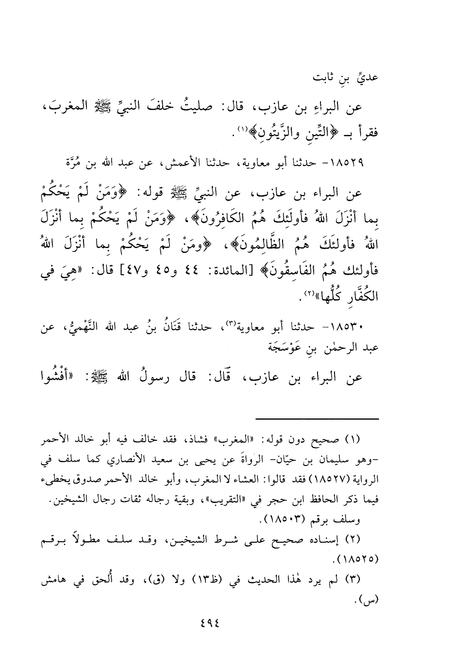 ١٨٥٢٩ - حَدَّثَنَا أَبُو مُعَاوِيَةَ، حَدَّثَنَا الْأَعْمَشُ، عَنْ عَبْدِ اللهِ بْنِ مُرَّةَ، عَنْ الْبَرَاءِ بْنِ عَازِبٍ، عَنِ النَّبِيِّ صَلَّى اللهُ عَلَيْهِ وَسَلَّمَ قَوْلُهُ: {وَمَنْ لَمْ يَحْكُمْ بِمَا أَنْزَلَ اللهُ فَأُولَئِكَ هُمُ الْكَافِرُونَ} [المائدة: ٤٤] {وَمَنْ لَمْ يَحْكُمْ بِمَا أَنْزَلَ اللهُ فَأُولَئِكَ هُمُ الظَّالِمُونَ} [المائدة: ٤٥] {وَمَنْ لَمْ يَحْكُمْ بِمَا أَنْزَلَ اللهُ فَأُولَئِكَ هُمُ الْفَاسِقُونَ} [المائدة: ٤٧] قَالَ: " هِيَ فِي الْكُفَّارِ كُلُّهَا " (٢)