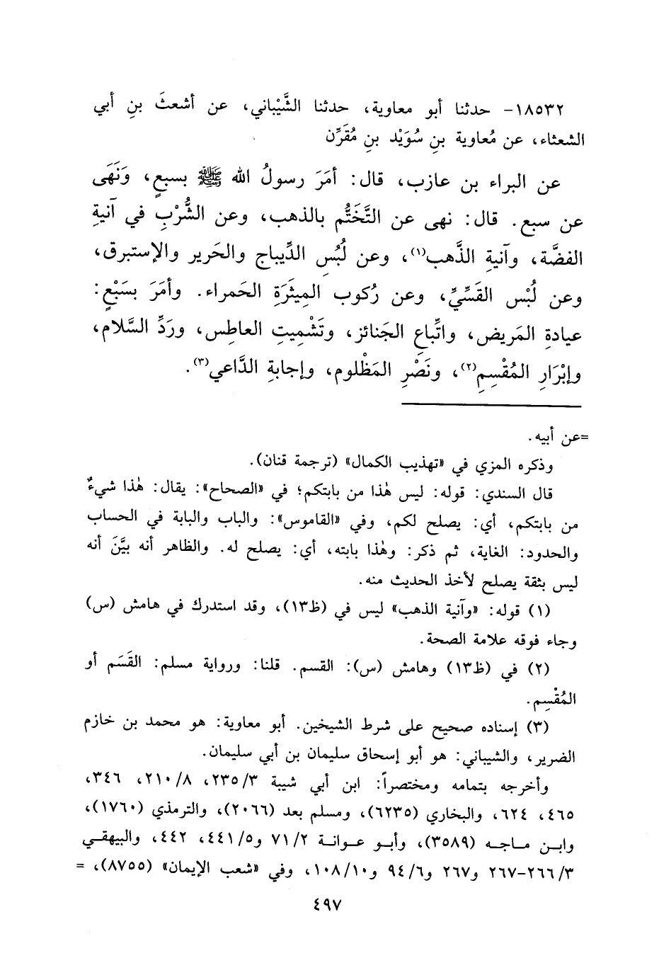 ١٨٥٣٢ - حَدَّثَنَا أَبُو مُعَاوِيَةَ، حَدَّثَنَا الشَّيْبَانِيُّ، عَنْ أَشْعَثَ بْنِ أَبِي الشَّعْثَاءِ، عَنْ مُعَاوِيَةَ بْنِ سُوَيْدِ بْنِ مُقَرِّنٍ، عَنِ الْبَرَاءِ بْنِ عَازِبٍ، قَالَ: أَمَرَ رَسُولُ اللهِ صَلَّى اللهُ عَلَيْهِ وَسَلَّمَ بِسَبْعٍ، وَنَهَى عَنْ سَبْعٍ، قَالَ: " نَهَى عَنِ التَّخَتُّمِ بِالذَّهَبِ، وَعَنِ الشُّرْبِ فِي آنِيَةِ الْفِضَّةِ، وَآنِيَةِ الذَّهَبِ، (١) وَعَنْ لُبْسِ الدِّيبَاجِ وَالْحَرِيرِ وَالْإِسْتَبْرَقِ، وَعَنْ لُبْسِ الْقَسِّيِّ، وَعَنْ رُكُوبِ الْمِيثَرَةِ الْحَمْرَاءِ. وَأَمَرَ بِسَبْعٍ عِيَادَةِ الْمَرِيضِ، وَاتِّبَاعِ الْجَنَائِزِ، وَتَشْمِيتِ الْعَاطِسِ، وَرَدِّ السَّلَامِ وَإِبْرَارِ الْمُقْسِمِ، (٢) وَنَصْرِ الْمَظْلُومِ، وَإِجَابَةِ الدَّاعِي " (٣)