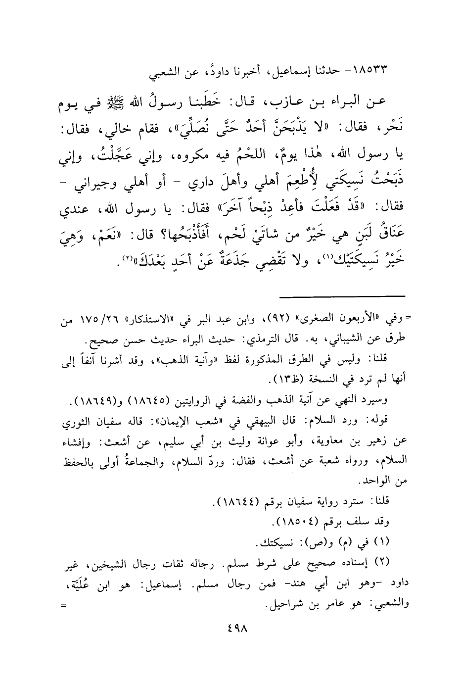 ١٨٥٣٣ - حَدَّثَنَا إِسْمَاعِيلُ، أَخْبَرَنَا دَاوُدُ، عَنْ الشَّعْبِيِّ، عَنِ الْبَرَاءِ بْنِ عَازِبٍ، قَالَ: خَطَبَنَا رَسُولُ اللهِ صَلَّى اللهُ عَلَيْهِ وَسَلَّمَ، فِي يَوْمِ نَحْرٍ فَقَالَ: " لَا يَذْبَحَنَّ أَحَدٌ حَتَّى نُصَلِّيَ "، فَقَامَ خَالِي، فَقَالَ: يَا رَسُولَ اللهِ، هَذَا يَوْمٌ اللَّحْمُ فِيهِ مَكْرُوهٌ، وَإِنِّي عَجَّلْتُ، وَإِنِّي ذَبَحْتُ نَسِيكَتِي لِأُطْعِمَ أَهْلِي وَأَهْلَ دَارِي، أَوْ أَهْلِي وَجِيرَانِي، فَقَالَ: " قَدْ فَعَلْتَ فَأَعِدْ ذَبْحًا آخَرَ "، فَقَالَ: يَا رَسُولَ اللهِ، عِنْدِي عَنَاقُ لَبَنٍ هِيَ خَيْرٌ مِنْ شَاتَيْ لَحْمٍ، أَفَأَذْبَحُهَا؟ قَالَ: " نَعَمْ، وَهِيَ خَيْرُ نَسِيكَتَيكَ (١) ، وَلَا تَقْضِي جَذَعَةٌ عَنْ أَحَدٍ بَعْدَكَ " (٢)