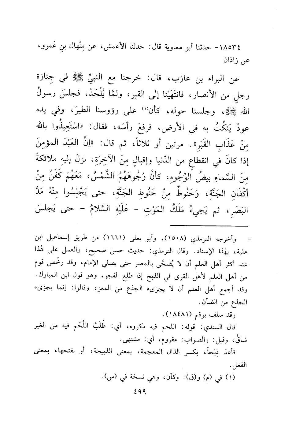 ١٨٥٣٤ - حَدَّثَنَا أَبُو مُعَاوِيَةَ، قَالَ: حَدَّثَنَا الْأَعْمَشُ، عَنْ مِنْهَالِ بْنِ عَمْرٍو، عَنْ زَاذَانَ، عَنِ الْبَرَاءِ بْنِ عَازِبٍ، قَالَ: خَرَجْنَا مَعَ النَّبِيِّ صَلَّى اللهُ عَلَيْهِ وَسَلَّمَ، فِي جِنَازَةِ رَجُلٍ مِنَ الْأَنْصَارِ، فَانْتَهَيْنَا إِلَى الْقَبْرِ، وَلَمَّا يُلْحَدْ، فَجَلَسَ رَسُولُ اللهِ صَلَّى اللهُ عَلَيْهِ وَسَلَّمَ، وَجَلَسْنَا حَوْلَهُ، كَأَنَّ (١) عَلَى رُءُوسِنَا الطَّيْرَ، وَفِي يَدِهِ عُودٌ يَنْكُتُ فِي الْأَرْضِ، فَرَفَعَ رَأْسَهُ، فَقَالَ: " اسْتَعِيذُوا بِاللهِ مِنْ عَذَابِ الْقَبْرِ مَرَّتَيْنِ، أَوْ ثَلَاثًا، "، ثُمَّ قَالَ: " إِنَّ الْعَبْدَ الْمُؤْمِنَ إِذَا كَانَ فِي انْقِطَاعٍ مِنَ الدُّنْيَا وَإِقْبَالٍ مِنَ الْآخِرَةِ، نَزَلَ إِلَيْهِ مَلَائِكَةٌ مِنَ السَّمَاءِ بِيضُ الْوُجُوهِ، كَأَنَّ وُجُوهَهُمُ الشَّمْسُ، مَعَهُمْ كَفَنٌ مِنْ أَكْفَانِ الْجَنَّةِ، وَحَنُوطٌ مِنْ حَنُوطِ الْجَنَّةِ، حَتَّى يَجْلِسُوا مِنْهُ مَدَّ الْبَصَرِ، ثُمَّ يَجِيءُ مَلَكُ الْمَوْتِ، عَلَيْهِ السَّلَامُ، حَتَّى يَجْلِسَ