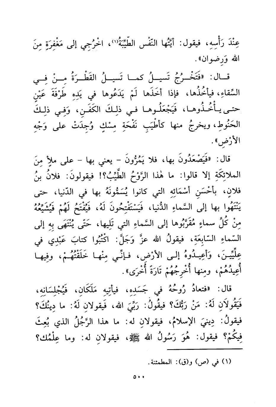عِنْدَ رَأْسِهِ، فَيَقُولُ: أَيَّتُهَا النَّفْسُ الطَّيِّبَةُ، (١) اخْرُجِي إِلَى مَغْفِرَةٍ مِنَ اللهِ وَرِضْوَانٍ ". قَالَ: " فَتَخْرُجُ تَسِيلُ كَمَا تَسِيلُ الْقَطْرَةُ مِنْ فِي السِّقَاءِ، فَيَأْخُذُهَا، فَإِذَا أَخَذَهَا لَمْ يَدَعُوهَا فِي يَدِهِ طَرْفَةَ عَيْنٍ حَتَّى يَأْخُذُوهَا، فَيَجْعَلُوهَا فِي ذَلِكَ الْكَفَنِ، وَفِي ذَلِكَ الْحَنُوطِ، وَيَخْرُجُ مِنْهَا كَأَطْيَبِ نَفْحَةِ مِسْكٍ وُجِدَتْ عَلَى وَجْهِ الْأَرْضِ " قَالَ: " فَيَصْعَدُونَ بِهَا، فَلَا يَمُرُّونَ، يَعْنِي بِهَا، عَلَى مَلَإٍ مِنَ الْمَلَائِكَةِ، إِلَّا قَالُوا: مَا هَذَا الرُّوحُ الطَّيِّبُ؟ فَيَقُولُونَ: فُلَانُ بْنُ فُلَانٍ، بِأَحْسَنِ أَسْمَائِهِ الَّتِي كَانُوا يُسَمُّونَهُ بِهَا فِي الدُّنْيَا، حَتَّى يَنْتَهُوا بِهَا إِلَى السَّمَاءِ الدُّنْيَا، فَيَسْتَفْتِحُونَ لَهُ، فَيُفْتَحُ لَهُمْ فَيُشَيِّعُهُ مِنْ كُلِّ سَمَاءٍ مُقَرَّبُوهَا إِلَى السَّمَاءِ الَّتِي تَلِيهَا، حَتَّى يُنْتَهَى بِهِ إِلَى السَّمَاءِ السَّابِعَةِ، فَيَقُولُ اللهُ عَزَّ وَجَلَّ: اكْتُبُوا كِتَابَ عَبْدِي فِي عِلِّيِّينَ، وَأَعِيدُوهُ إِلَى الْأَرْضِ، فَإِنِّي مِنْهَا خَلَقْتُهُمْ، وَفِيهَا أُعِيدُهُمْ، وَمِنْهَا أُخْرِجُهُمْ تَارَةً أُخْرَى ". قَالَ: " فَتُعَادُ رُوحُهُ فِي جَسَدِهِ، فَيَأْتِيهِ مَلَكَانِ، فَيُجْلِسَانِهِ، فَيَقُولَانِ لَهُ: مَنْ رَبُّكَ؟ فَيَقُولُ: رَبِّيَ اللهُ، فَيَقُولَانِ لَهُ: مَا دِينُكَ؟ فَيَقُولُ: دِينِيَ الْإِسْلَامُ، فَيَقُولَانِ لَهُ: مَا هَذَا الرَّجُلُ الَّذِي بُعِثَ فِيكُمْ؟ فَيَقُولُ: هُوَ رَسُولُ اللهِ صَلَّى اللهُ عَلَيْهِ وَسَلَّمَ، فَيَقُولَانِ لَهُ: وَمَا عِلْمُكَ؟
