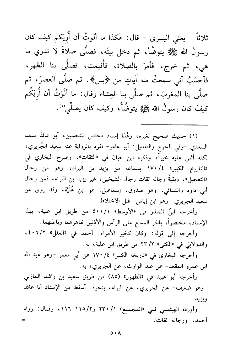 ثَلَاثًا، يَعْنِي الْيُسْرَى، "، قَالَ: " هَكَذَا مَا أَلَوْتُ أَنْ أُرِيَكُمْ كَيْفَ كَانَ رَسُولُ اللهِ صَلَّى اللهُ عَلَيْهِ وَسَلَّمَ يَتَوَضَّأُ "، ثُمَّ دَخَلَ بَيْتَهُ، فَصَلَّى صَلَاةً لَا نَدْرِي مَا هِيَ، ثُمَّ خَرَجَ، فَأَمَرَ بِالصَّلَاةِ، فَأُقِيمَتْ، فَصَلَّى بِنَا الظُّهْرَ، فَأَحْسِبُ أَنِّي سَمِعْتُ مِنْهُ آيَاتٍ مِنْ يس، ثُمَّ صَلَّى الْعَصْرَ، ثُمَّ صَلَّى بِنَا الْمَغْرِبَ، ثُمَّ صَلَّى بِنَا الْعِشَاءَ. وَقَالَ: " مَا أَلَوْتُ أَنْ أُرِيَكُمْ كَيْفَ رَسُولُ اللهِ صَلَّى اللهُ عَلَيْهِ وَسَلَّمَ يَتَوَضَّأُ، وَكَيْفَ كَانَ يُصَلِّي " (١)
