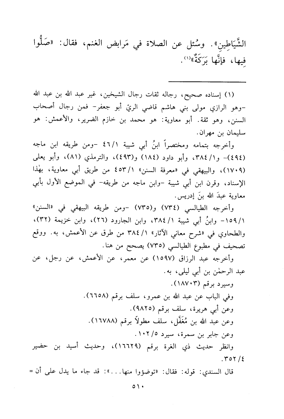الشَّيَاطِينِ ". وَسُئِلَ عَنِ الصَّلَاةِ فِي مَرَابِضِ الْغَنَمِ، فَقَالَ: " صَلُّوا فِيهَا، فَإِنَّهَا بَرَكَةٌ " (١)