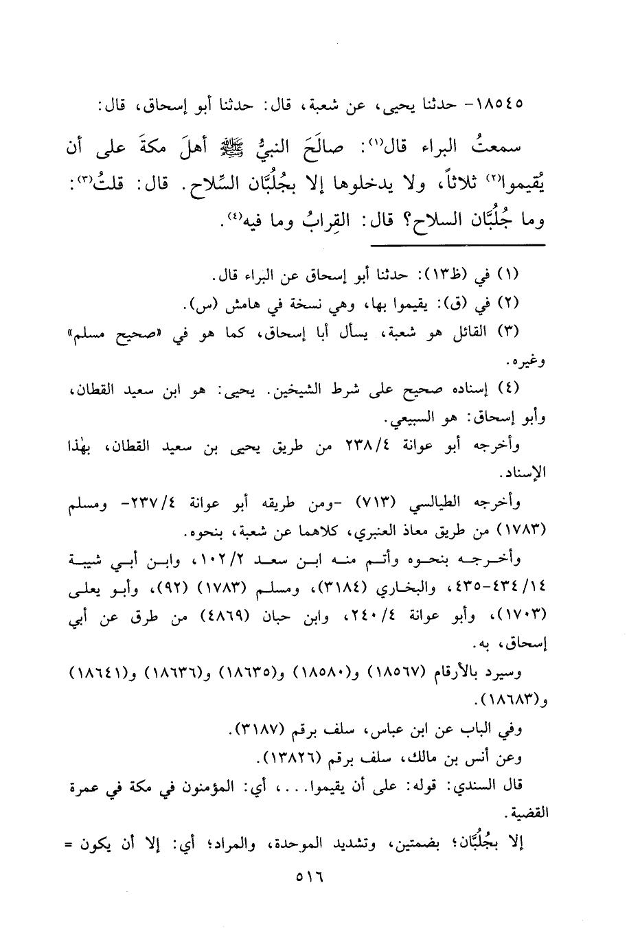 ١٨٥٤٥ - حَدَّثَنَا يَحْيَى، عَنْ شُعْبَةَ، قَالَ: حَدَّثَنَا أَبُو إِسْحَاقَ، قَالَ: سَمِعْتُ الْبَرَاءَ بْنَ عَازِبٍ، قَالَ: (١) " صَالَحَ النَّبِيُّ صَلَّى اللهُ عَلَيْهِ وَسَلَّمَ أَهْلَ مَكَّةَ عَلَى أَنْ يُقِيمُوا (٢) ثَلَاثًا، وَلَا يَدْخُلُوهَا إِلَّا بِجُلُبَّانِ السِّلَاحِ " قَالَ: قُلْتُ: (٣) وَمَا جُلُبَّانُ السِّلَاحِ؟ قَالَ: الْقِرَابُ وَمَا فِيهِ (٤)
