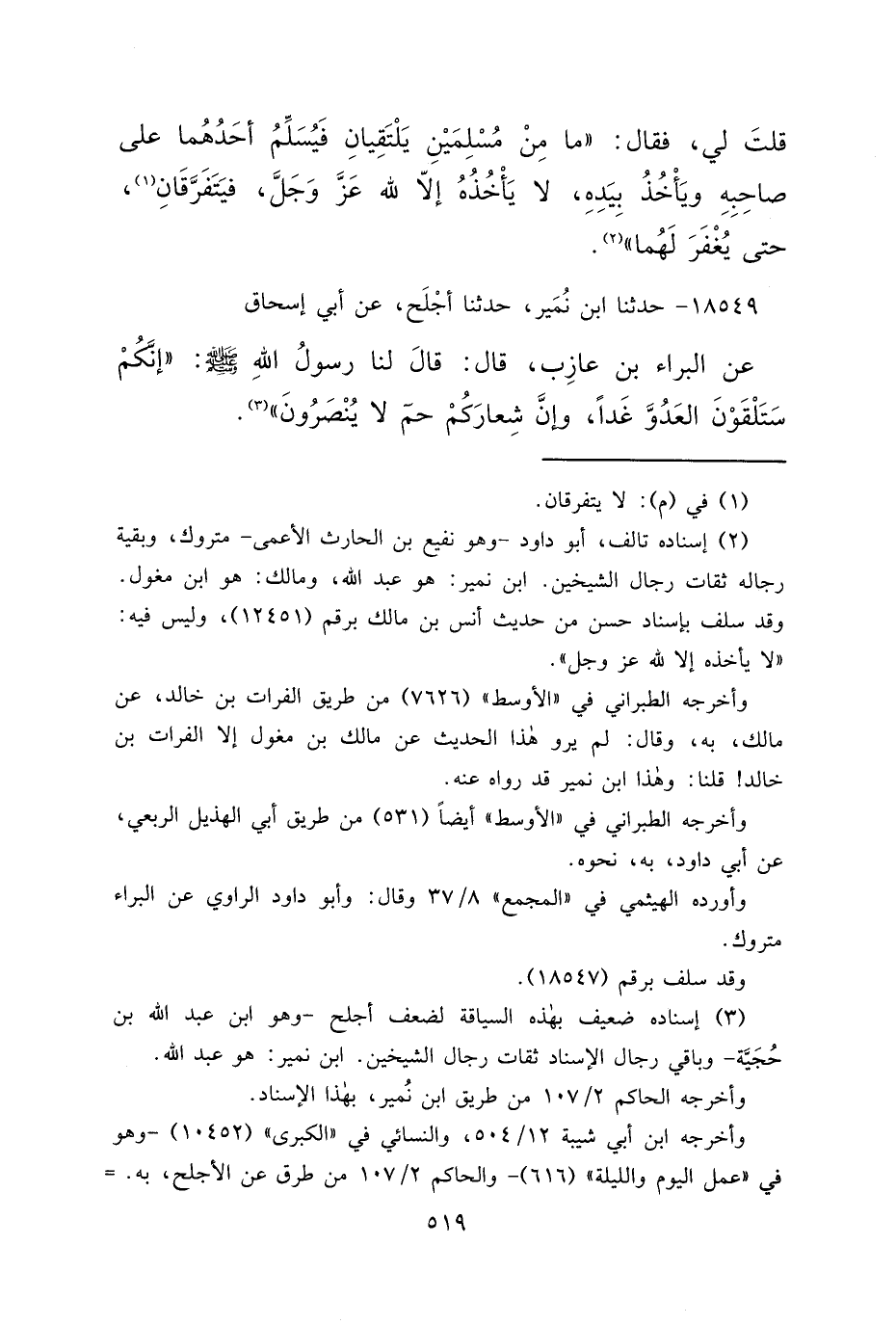 ١٨٥٤٩ - حَدَّثَنَا ابْنُ نُمَيْرٍ، حَدَّثَنَا أَجْلَحُ، عَنْ أَبِي إِسْحَاقَ، عَنِ الْبَرَاءِ بْنِ عَازِبٍ، قَالَ: قَالَ لَنَا رَسُولُ اللهِ صَلَّى اللهُ عَلَيْهِ وَسَلَّمَ: " إِنَّكُمْ سَتَلْقَوْنَ الْعَدُوَّ غَدًا، وَإِنَّ شِعَارَكُمْ حم لَا يُنْصَرُونَ " (٣)