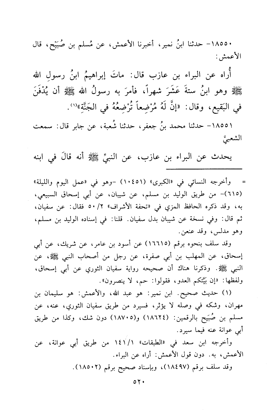 ١٨٥٥٠ - حَدَّثَنَا ابْنُ نُمَيْرٍ، أَخْبَرَنَا الْأَعْمَشُ، عَنْ مُسْلِمِ بْنِ صُبَيْحٍ، قَالَ الْأَعْمَشُ: أُرَاهُ عَنِ الْبَرَاءِ بْنِ عَازِبٍ، قَالَ: مَاتَ إِبْرَاهِيمُ ابْنُ رَسُولِ اللهِ صَلَّى اللهُ عَلَيْهِ وَسَلَّمَ، وَهُوَ ابْنُ سِتَّةَ عَشَرَ شَهْرًا، فَأَمَرَ بِهِ رَسُولُ اللهِ صَلَّى اللهُ عَلَيْهِ وَسَلَّمَ، أَنْ يُدْفَنَ فِي الْبَقِيعِ وَقَالَ: " إِنَّ لَهُ مُرْضِعًا يُرْضِعُهُ فِي الْجَنَّةِ " (١)
