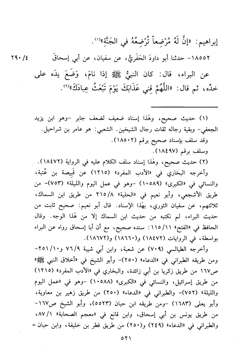 ١٨٥٥٢ - حَدَّثَنَا أَبُو دَاوُدَ الْحَفَرِيُّ، عَنْ سُفْيَانَ، عَنْ أَبِي إِسْحَاقَ، عَنِ الْبَرَاءِ، قَالَ: كَانَ النَّبِيُّ صَلَّى اللهُ عَلَيْهِ وَسَلَّمَ إِذَا نَامَ، وَضَعَ يَدَهُ عَلَى خَدِّهِ، ثُمَّ قَالَ: " اللهُمَّ قِنِي عَذَابَكَ يَوْمَ تَبْعَثُ عِبَادَكَ " (٢)