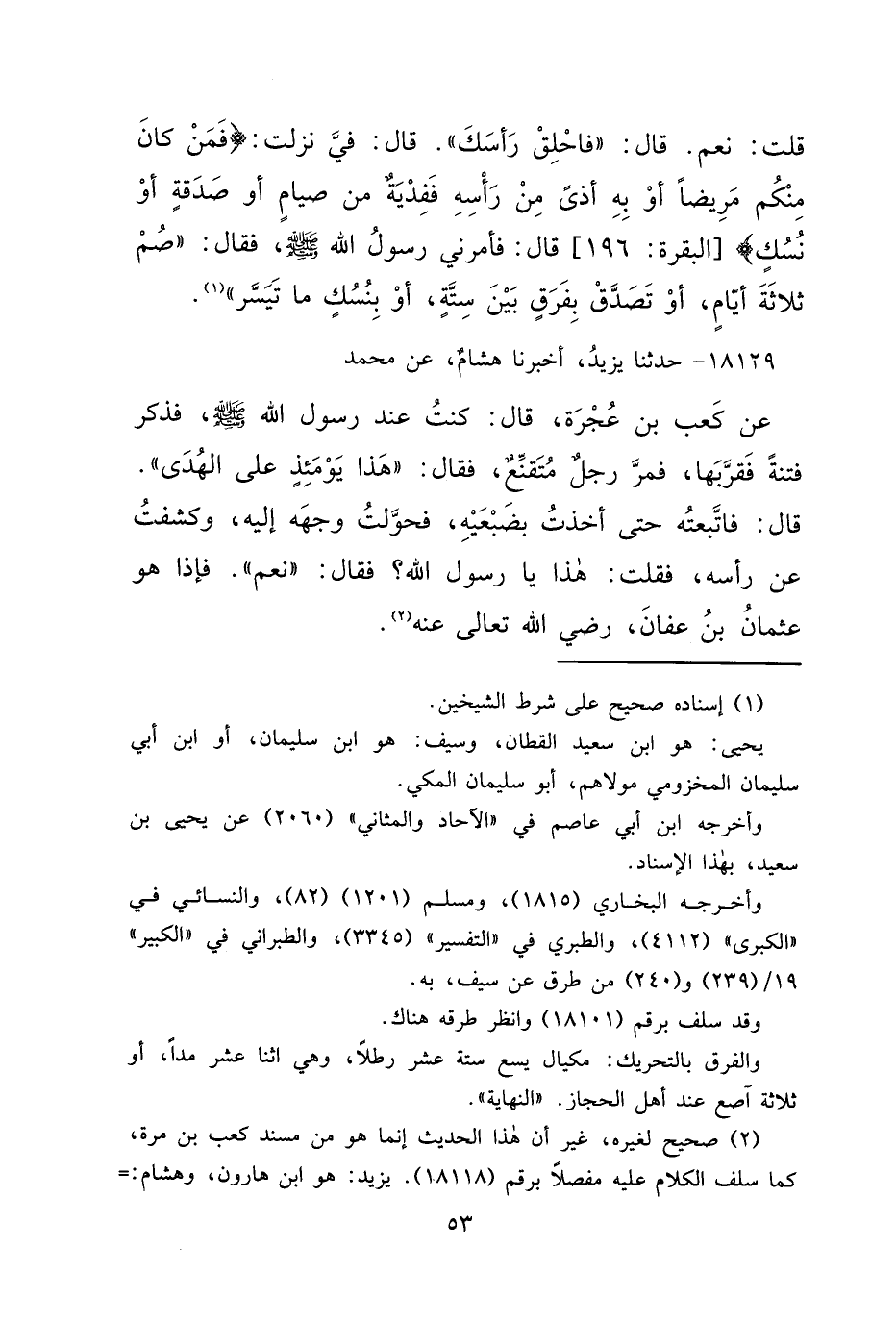١٨١٢٩ - حَدَّثَنَا يَزِيدُ، أَخْبَرَنَا هِشَامٌ، عَنْ مُحَمَّدٍ، عَنْ كَعْبِ بْنِ عُجْرَةَ قَالَ: كُنْتُ عِنْدَ رَسُولِ اللهِ صَلَّى اللهُ عَلَيْهِ وَسَلَّمَ، فَذَكَرَ فِتْنَةً فَقَرَّبَهَا، فَمَرَّ رَجُلٌ مُتَقَنِّعٌ فَقَالَ: " هَذَا يَوْمَئِذٍ عَلَى الْهُدَى " قَالَ: فَاتَّبَعْتُهُ حَتَّى أَخَذْتُ بِضَبْعَيْهِ، فَحَوَّلْتُ وَجْهَهُ إِلَيْهِ، وَكَشَفْتُ عَنْ رَأْسِهِ، فَقُلْتُ هَذَا يَا رَسُولَ اللهِ؟ قَالَ: " نَعَمْ " فَإِذَا هُوَ عُثْمَانُ بْنُ عَفَّانَ رَضِيَ اللهُ عَنْهُ (٢)