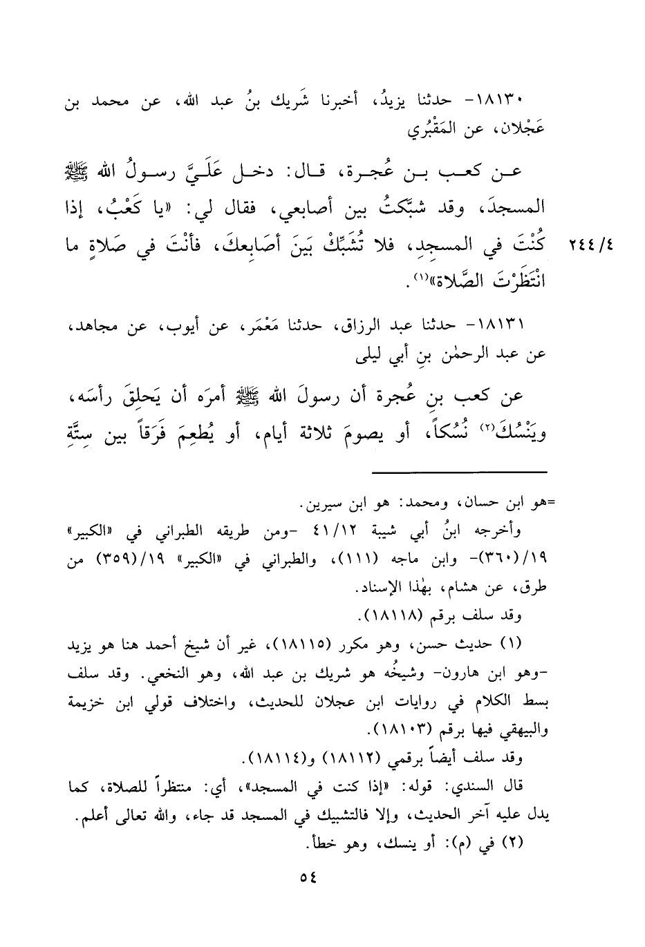 ١٨١٣٠ - حَدَّثَنَا يَزِيدُ، أَخْبَرَنَا شَرِيكُ بْنُ عَبْدِ اللهِ، عَنْ مُحَمَّدِ بْنِ عَجْلَانَ، عَنِ الْمَقْبُرِيِّ، عَنْ كَعْبِ بْنِ عُجْرَةَ قَالَ: دَخَلَ عَلَيَّ رَسُولُ اللهِ صَلَّى اللهُ عَلَيْهِ وَسَلَّمَ الْمَسْجِدَ وَقَدْ شَبَّكْتُ بَيْنَ أَصَابِعِي، فَقَالَ لِي: " يَا كَعْبُ إِذَا كُنْتَ فِي الْمَسْجِدِ، فَلَا تُشَبِّكْ بَيْنَ أَصَابِعِكَ، فَأَنْتَ فِي صَلَاةٍ مَا انْتَظَرْتَ الصَّلَاةَ " (١)