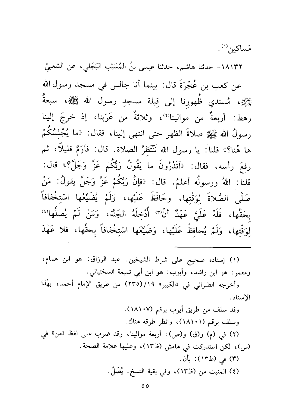 ١٨١٣٢ - حَدَّثَنَا هَاشِمٌ، حَدَّثَنَا عِيسَى بْنُ الْمُسَيَّبِ الْبَجَلِيُّ، عَنِ الشَّعْبِيِّ، عَنْ كَعْبِ بْنِ عُجْرَةَ، قَالَ: بَيْنَمَا أَنَا جَالِسٌ فِي مَسْجِدِ رَسُولِ اللهِ صَلَّى اللهُ عَلَيْهِ وَسَلَّمَ، مُسْنِدِي ظُهُورِنَا إِلَى قِبْلَةِ مَسْجِدِ رَسُولِ اللهِ صَلَّى اللهُ عَلَيْهِ وَسَلَّمَ، سَبْعَةُ رَهْطٍ أَرْبَعَةٌ مِنْ مَوَالِينَا، (٢) وَثَلَاثَةٌ مِنْ عَرَبِنَا، إِذْ خَرَجَ إِلَيْنَا رَسُولُ اللهِ صَلَّى اللهُ عَلَيْهِ وَسَلَّمَ، صَلَاةَ الظُّهْرِ حَتَّى انْتَهَى إِلَيْنَا، فَقَالَ: " مَا يُجْلِسُكُمْ هَاهُنَا " قُلْنَا: يَا رَسُولَ اللهِ نَنْتَظِرُ الصَّلَاةَ، قَالَ: فَأَرَمَّ قَلِيلًا، ثُمَّ رَفَعَ رَأْسَهُ، فَقَالَ: " أَتَدْرُونَ مَا يَقُولُ رَبُّكُمْ عَزَّ وَجَلَّ، قَالَ: " قُلْنَا: اللهُ وَرَسُولُهُ أَعْلَمُ، قَالَ: " فَإِنَّ رَبَّكُمْ عَزَّ وَجَلَّ يَقُولُ: مَنْ صَلَّى الصَّلَاةَ لِوَقْتِهَا، وَحَافَظَ عَلَيْهَا، وَلَمْ يُضَيِّعْهَا اسْتِخْفَافًا بِحَقِّهَا فَلَهُ عَلَيَّ عَهْدٌ أَنْ (٣) أُدْخِلَهُ الْجَنَّةَ، وَمَنْ لَمْ يُصَلِّهَا (٤) لِوَقْتِهَا، وَلَمْ يُحَافِظْ عَلَيْهَا، وَضَيَّعَهَا اسْتِخْفَافًا بِحَقِّهَا، فَلَا عَهْدَ