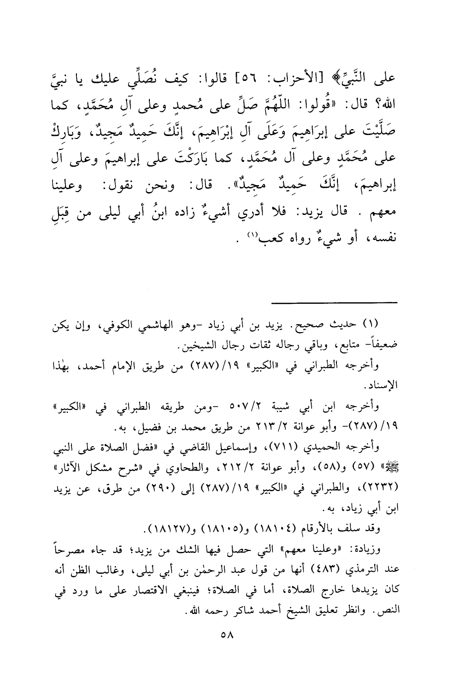 عَلَى النَّبِيِّ} [الأحزاب: ٥٦] قَالُوا: كَيْفَ نُصَلِّي عَلَيْكَ يَا نَبِيَّ اللهِ؟ قَالَ: " قُولُوا اللهُمَّ صَلِّ عَلَى مُحَمَّدٍ وَعَلَى آلِ مُحَمَّدٍ، كَمَا صَلَّيْتَ عَلَى إِبْرَاهِيمَ، وَعَلَى آلِ إِبْرَاهِيمَ إِنَّكَ حَمِيدٌ مَجِيدٌ، وَبَارِكْ عَلَى مُحَمَّدٍ، وَعَلَى آلِ مُحَمَّدٍ كَمَا بَارَكْتَ عَلَى إِبْرَاهِيمَ وَعَلَى آلِ إِبْرَاهِيمَ إِنَّكَ حَمِيدٌ مَجِيدٌ " قَالَ: وَنَحْنُ نَقُولُ وَعَلَيْنَا مَعَهُمْ، قَالَ يَزِيدُ: فَلَا أَدْرِي أَشَيْءٌ زَادَهُ ابْنُ أَبِي لَيْلَى مِنْ قِبَلِ نَفْسِهِ أَوْ شَيْءٌ رَوَاهُ كَعْبٌ (١)