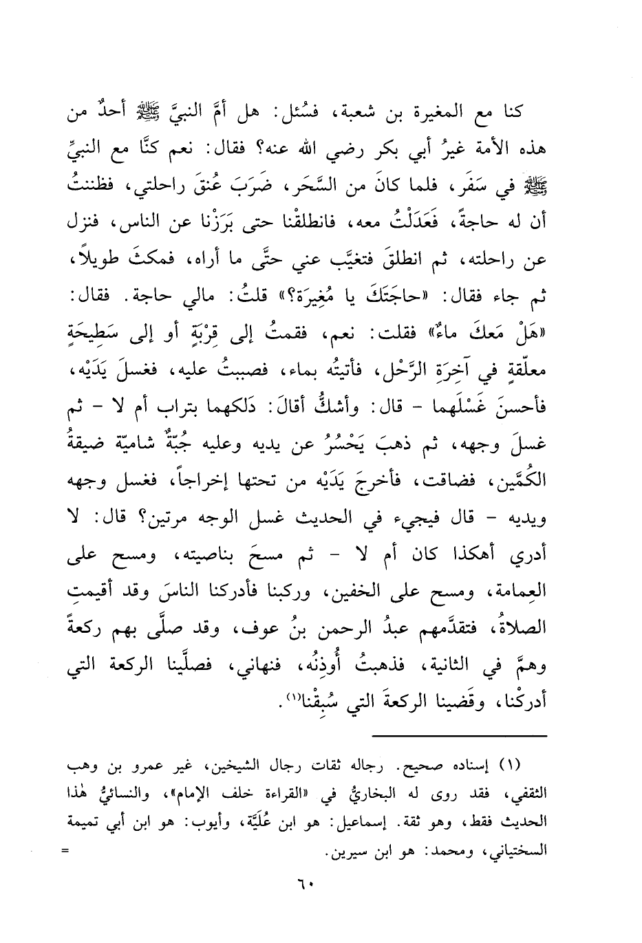 كُنَّا مَعَ الْمُغِيرَةِ بْنِ شُعْبَةَ، فَسُئِلَ: هَلْ أَمَّ النَّبِيَّ صَلَّى اللهُ عَلَيْهِ وَسَلَّمَ أَحَدٌ مِنْ هَذِهِ الْأُمَّةِ غَيْرَ أَبِي بَكْرٍ رَضِيَ اللهُ عَنْهُ؟ فَقَالَ: نَعَمْ، كُنَّا مَعَ النَّبِيِّ صَلَّى اللهُ عَلَيْهِ وَسَلَّمَ فِي سَفَرٍ، فَلَمَّا كَانَ مِنَ السَّحَرِ، ضَرَبَ عُنُقَ رَاحِلَتِي، فَظَنَنْتُ أَنَّ لَهُ حَاجَةً، فَعَدَلْتُ مَعَهُ، فَانْطَلَقْنَا حَتَّى بَرَزْنَا عَنِ النَّاسِ، فَنَزَلَ عَنْ رَاحِلَتِهِ، ثُمَّ انْطَلَقَ، فَتَغَيَّبَ عَنِّي حَتَّى مَا أَرَاهُ، فَمَكَثَ طَوِيلًا، ثُمَّ جَاءَ، فَقَالَ: " حَاجَتَكَ يَا مُغِيرَةُ؟ " قُلْتُ: مَا لِي حَاجَةٌ، فَقَالَ: " هَلْ مَعَكَ مَاءٌ؟ " فَقُلْتُ: نَعَمْ، فَقُمْتُ إِلَى قِرْبَةٍ، أَوْ إِلَى سَطِيحَةٍ، مُعَلَّقَةٍ فِي آخِرَةِ الرَّحْلِ، فَأَتَيْتُهُ بِمَاءٍ، فَصَبَبْتُ عَلَيْهِ، فَغَسَلَ يَدَيْهِ، فَأَحْسَنَ غَسْلَهُمَا، قَالَ: وَأَشُكُّ أَقَالَ: دَلَّكَهُمَا بِتُرَابٍ أَمْ لَا، ثُمَّ غَسَلَ وَجْهَهُ، ثُمَّ ذَهَبَ يَحْسِرُ عَنْ يَدَيْهِ، وَعَلَيْهِ جُبَّةٌ شَامِيَّةٌ ضَيِّقَةُ الْكُمَّيْنِ، فَضَاقَتْ، فَأَخْرَجَ يَدَيْهِ مِنْ تَحْتِهَا إِخْرَاجًا، فَغَسَلَ وَجْهَهُ وَيَدَيْهِ،، قَالَ: فَيَجِيءُ فِي الْحَدِيثِ غَسْلُ الْوَجْهِ مَرَّتَيْنِ؟، قَالَ: لَا أَدْرِي أَهَكَذَا كَانَ أَمْ لَا؟، ثُمَّ مَسَحَ بِنَاصِيَتِهِ، وَمَسَحَ عَلَى الْعِمَامَةِ، وَمَسَحَ عَلَى الْخُفَّيْنِ، وَرَكِبْنَا فَأَدْرَكْنَا النَّاسَ وَقَدْ أُقِيمَتِ الصَّلَاةُ، فَتَقَدَّمَهُمْ عَبْدُ الرَّحْمَنِ بْنُ عَوْفٍ، وَقَدْ صَلَّى بِهِمْ رَكْعَةً وَهُمْ فِي الثَّانِيَةِ، فَذَهَبْتُ أُوذِنُهُ، فَنَهَانِي، فَصَلَّيْنَا الرَّكْعَةَ الَّتِي أَدْرَكْنَا، وَقَضَيْنَا الرَّكْعَةَ الَّتِي سُبِقْنَا (١)