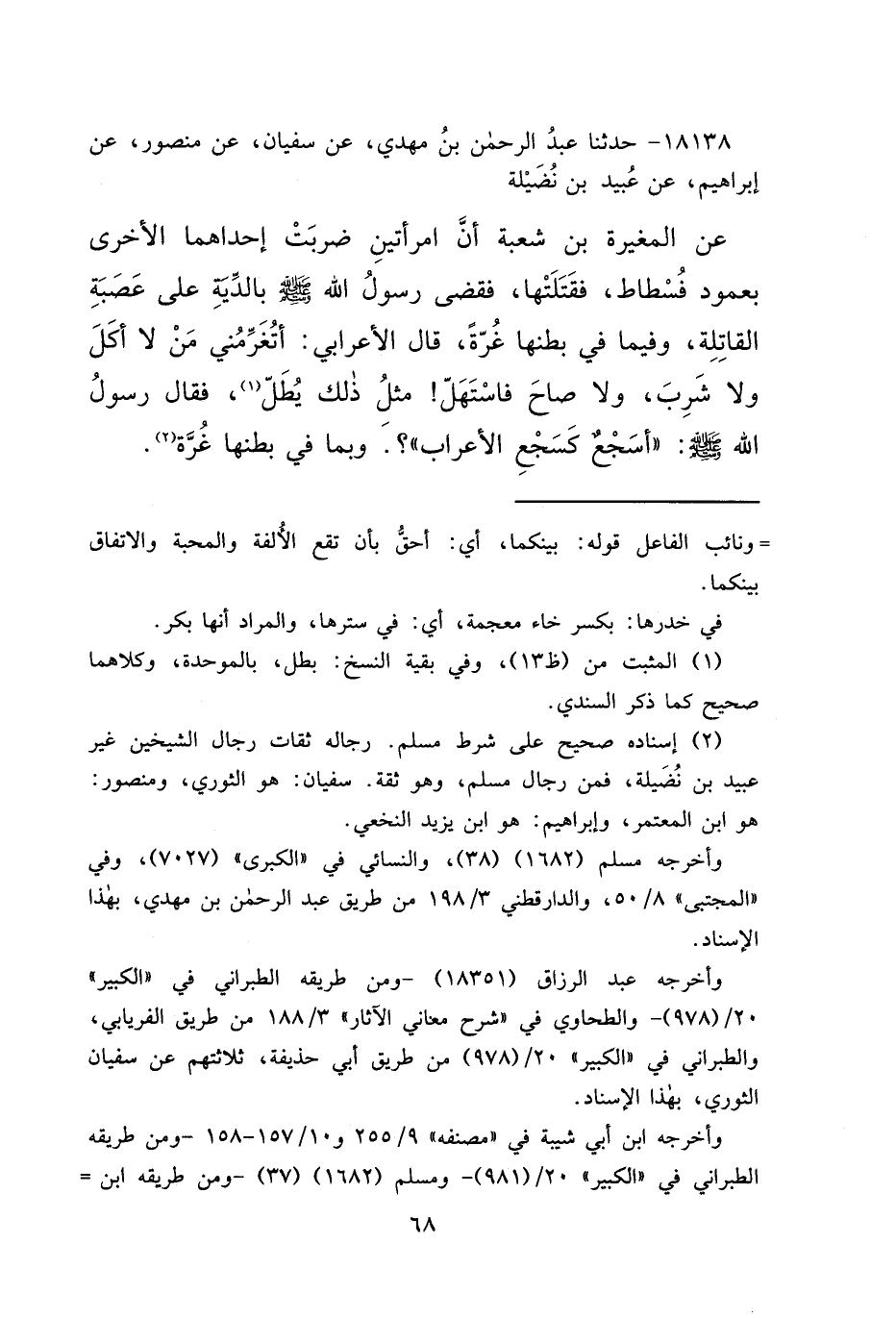 ١٨١٣٨ - حَدَّثَنَا عَبْدُ الرَّحْمَنِ بْنُ مَهْدِيٍّ، عَنْ سُفْيَانَ، عَنْ مَنْصُورٍ، عَنْ إِبْرَاهِيمَ، عَنْ عُبَيْدِ بْنِ نُضَيْلَةَ، عَنِ الْمُغِيرَةِ بْنِ شُعْبَةَ: أَنَّ امْرَأَتَيْنِ ضَرَبَتْ إِحْدَاهُمَا الْأُخْرَى بِعَمُودِ فُسْطَاطٍ، فَقَتَلَتْهَا، فَقَضَى رَسُولُ اللهِ صَلَّى اللهُ عَلَيْهِ وَسَلَّمَ بِالدِّيَةِ عَلَى عَصَبَةِ الْقَاتِلَةِ، وَفِيمَا فِي بَطْنِهَا غُرَّةٌ، قَالَ الْأَعْرَابِيُّ: أَتُغَرِّمُنِي مَنْ لَا أَكَلَ وَلَا شَرِبَ وَلَا صَاحَ، فَاسْتَهَلَّ مِثْلُ ذَلِكَ يُطَلُّ (١) ، فَقَالَ رَسُولُ اللهِ صَلَّى اللهُ عَلَيْهِ وَسَلَّمَ: " أَسَجْعٌ كَسَجْعِ الْأَعْرَابِ وَبِمَا فِي بَطْنِهَا غُرَّةٌ " (٢)