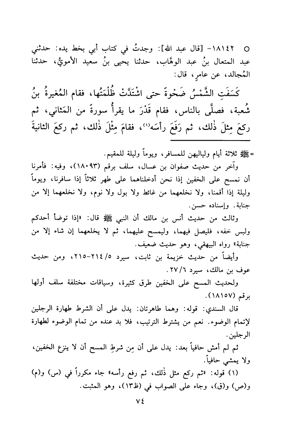 ° ١٨١٤٢ - قَالَ عَبْدُ اللهِ: وَجَدْتُ فِي كِتَابِ أَبِي بِخَطِّ يَدِهِ: حَدَّثَنِي عَبْدُ الْمُتَعَالِ بْنُ عَبْدِ الْوَهَّابِ، حَدَّثَنَا يَحْيَى بْنُ سَعِيدٍ الْأُمَوِيُّ، حَدَّثَنَا الْمُجَالِدُ، عَنْ عَامِرٍ قَالَ: كَسَفَتِ الشَّمْسُ ضَحْوَةً، حَتَّى اشْتَدَّتْ ظُلْمَتُهَا، فَقَامَ الْمُغِيرَةُ بْنُ شُعْبَةَ، فَصَلَّى بِالنَّاسِ، فَقَامَ قَدْرَ مَا يَقْرَأُ سُورَةً مِنَ الْمَثَانِي، ثُمَّ رَكَعَ مِثْلَ ذَلِكَ، ثُمَّ رَفَعَ رَأْسَهُ (١) فَقَامَ مِثْلَ ذَلِكَ، ثُمَّ رَكَعَ الثَّانِيَةَ